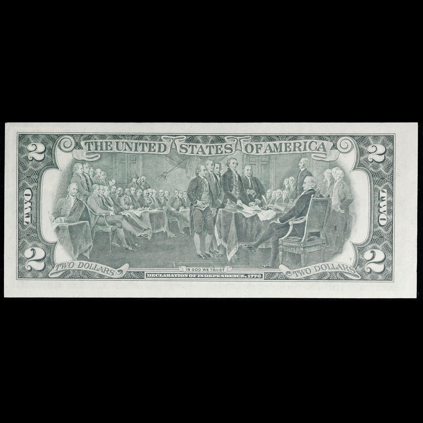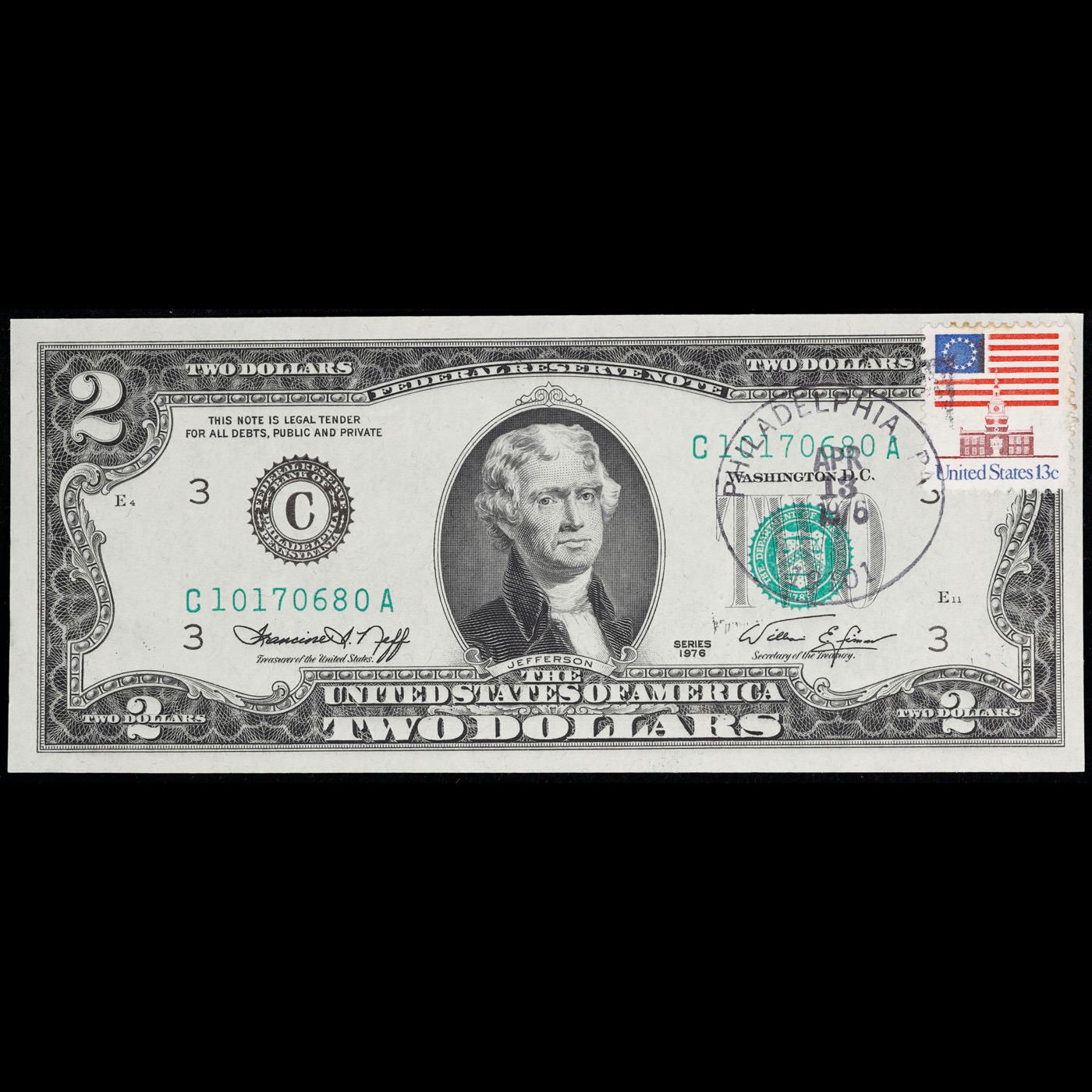 1976 $2 Federal Reserve Note 1st Day of Issue, with Stamp Grades Gem CU. On April 13, 1976, to celebrate the bicentennial of American independence, new $2 Federal Reserve Notes were issued with backs featuring the well-known painting Signing of the Declaration of Independence. These Notes all have a 13c Stamp or 2 stamps totaling 13c hand canceled on April 13, 1976 for the first day of issue of the new $2 notes. These official first-day-of-issue Bicentennial notes will be historic additions to your collection (designs and locations of the 13¢ stamps will vary).