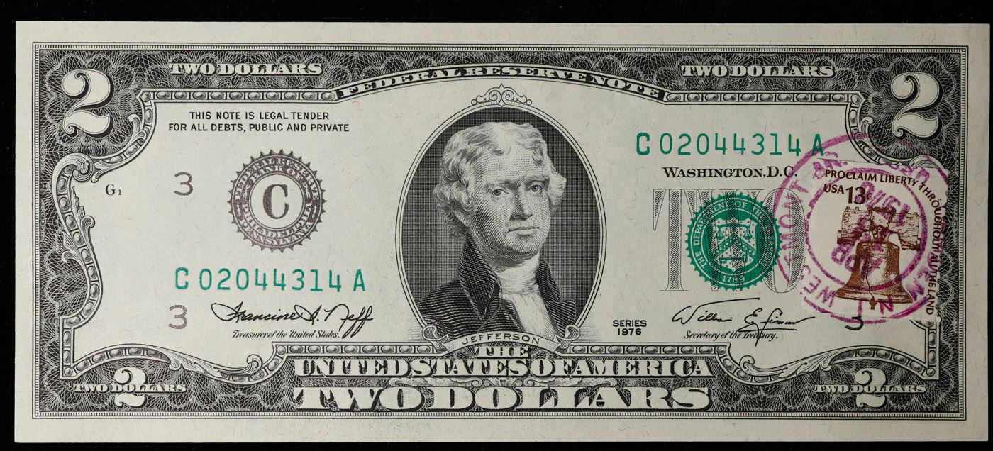 1976 $2 Federal Reserve Note 1st Day of Issue, with Stamp Grades Gem CU. On April 13, 1976, to celebrate the bicentennial of American independence, new $2 Federal Reserve Notes were issued with backs featuring the well-known painting Signing of the Declaration of Independence. These Notes all have a 13c Stamp or 2 stamps totaling 13c hand canceled on April 13, 1976 for the first day of issue of the new $2 notes. These official first-day-of-issue Bicentennial notes will be historic additions to your collection (designs and locations of the 13¢ stamps will vary).