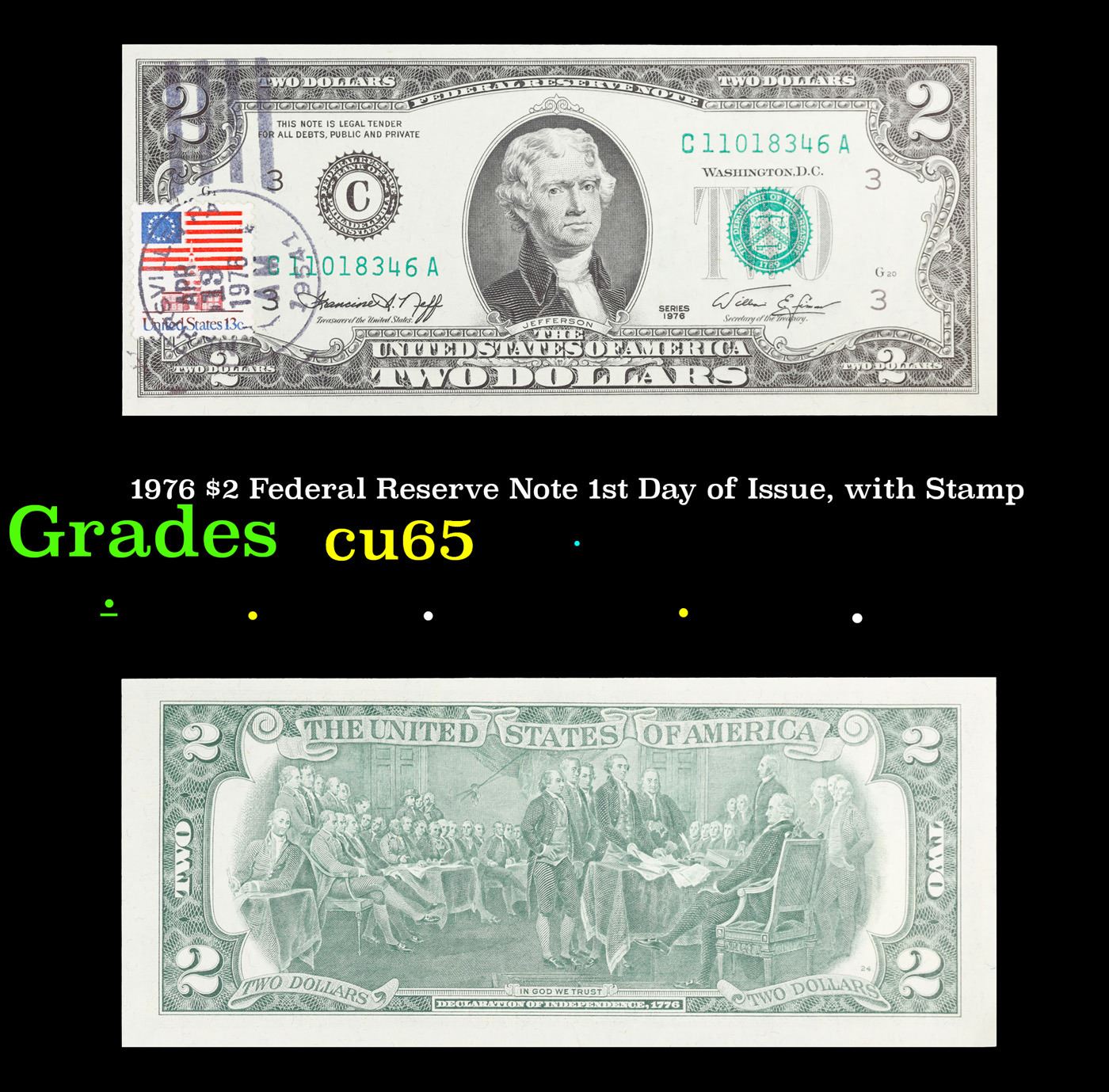 1976 $2 Federal Reserve Note 1st Day of Issue, with Stamp Grades Gem CU