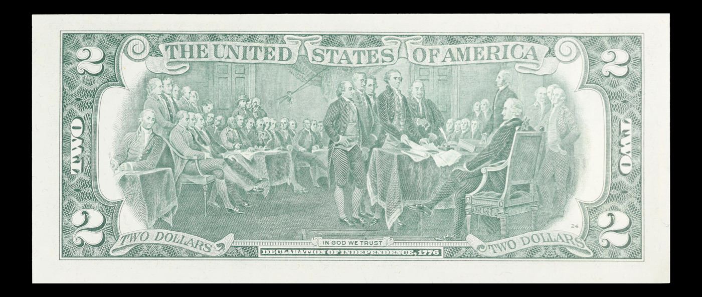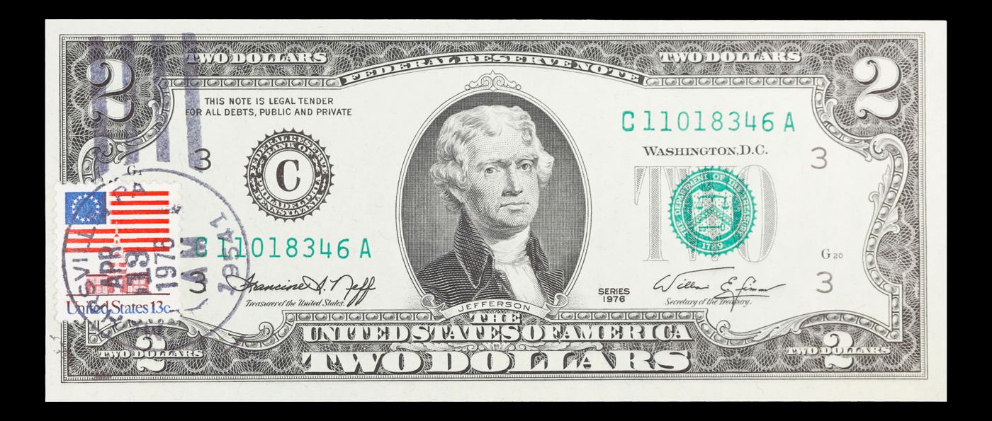 1976 $2 Federal Reserve Note 1st Day of Issue, with Stamp Grades Gem CU. On April 13, 1976, to celebrate the bicentennial of American independence, new $2 Federal Reserve Notes were issued with backs featuring the well-known painting Signing of the Declaration of Independence. These Notes all have a 13c Stamp or 2 stamps totaling 13c hand canceled on April 13, 1976 for the first day of issue of the new $2 notes. These official first-day-of-issue Bicentennial notes will be historic additions to your collection (designs and locations of the 13¢ stamps will vary).