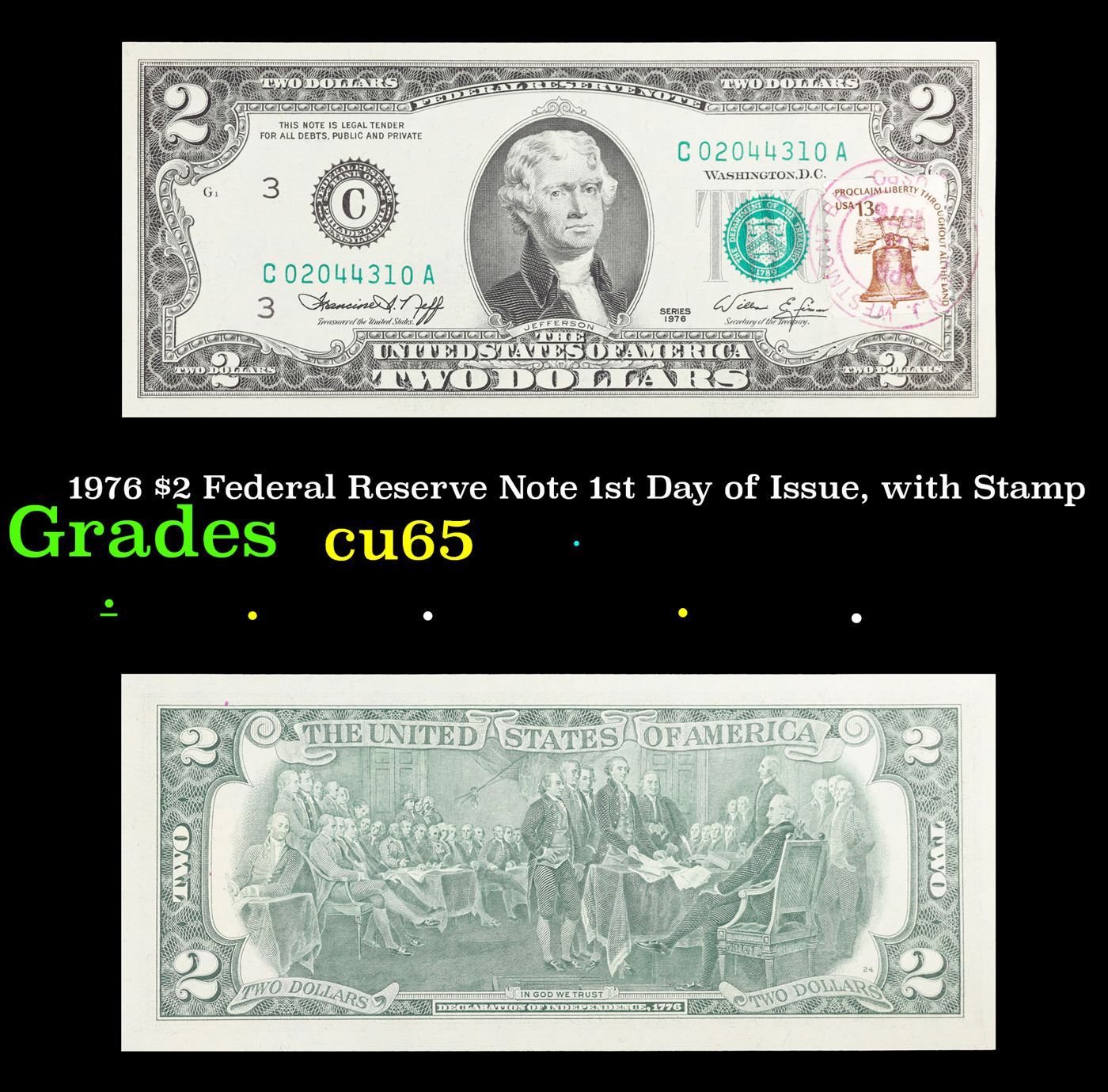1976 $2 Federal Reserve Note 1st Day of Issue, with Stamp Grades Gem CU