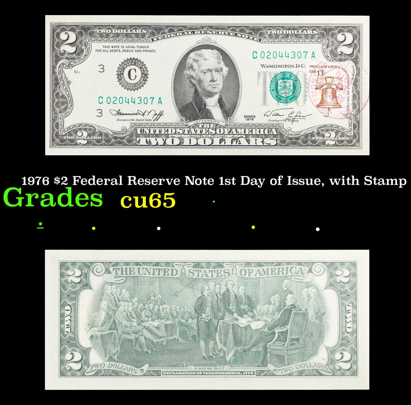 1976 $2 Federal Reserve Note 1st Day of Issue, with Stamp Grades Gem CU