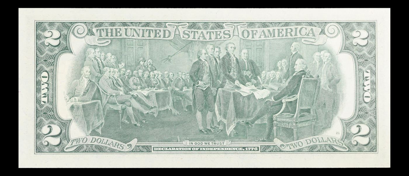 1976 $2 Federal Reserve Note 1st Day of Issue, with Stamp Grades Gem CU. On April 13, 1976, to celebrate the bicentennial of American independence, new $2 Federal Reserve Notes were issued with backs featuring the well-known painting Signing of the Declaration of Independence. These Notes all have a 13c Stamp or 2 stamps totaling 13c hand canceled on April 13, 1976 for the first day of issue of the new $2 notes. These official first-day-of-issue Bicentennial notes will be historic additions to your collection (designs and locations of the 13¢ stamps will vary).