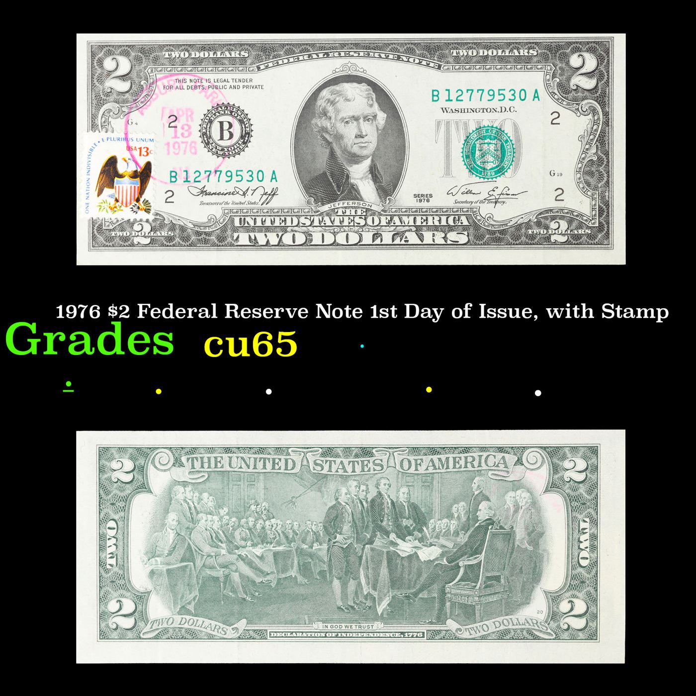 1976 $2 Federal Reserve Note 1st Day of Issue, with Stamp Grades Gem CU.
