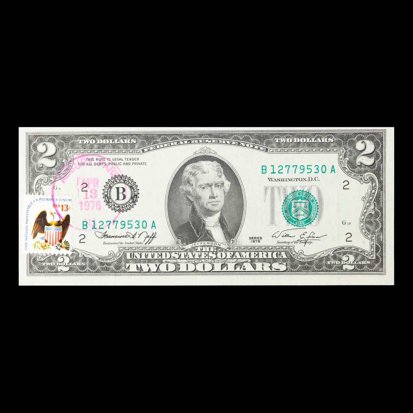 1976 $2 Federal Reserve Note 1st Day of Issue, with Stamp Grades Gem CU