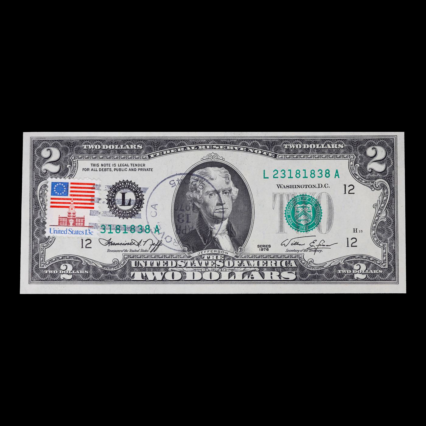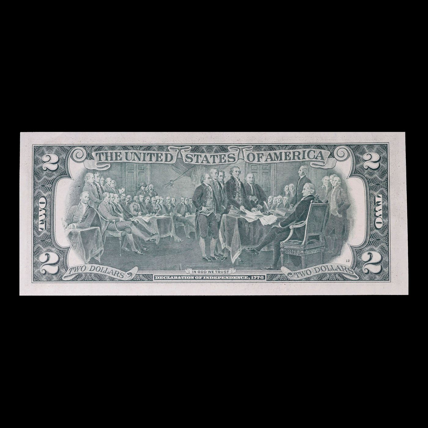1976 $2 Federal Reserve Note 1st Day of Issue, with Stamp Grades Gem CU. On April 13, 1976, to celebrate the bicentennial of American independence, new $2 Federal Reserve Notes were issued with backs featuring the well-known painting Signing of the Declaration of Independence. These Notes all have a 13c Stamp or 2 stamps totaling 13c hand canceled on April 13, 1976 for the first day of issue of the new $2 notes. These official first-day-of-issue Bicentennial notes will be historic additions to your collection (designs and locations of the 13¢ stamps will vary).