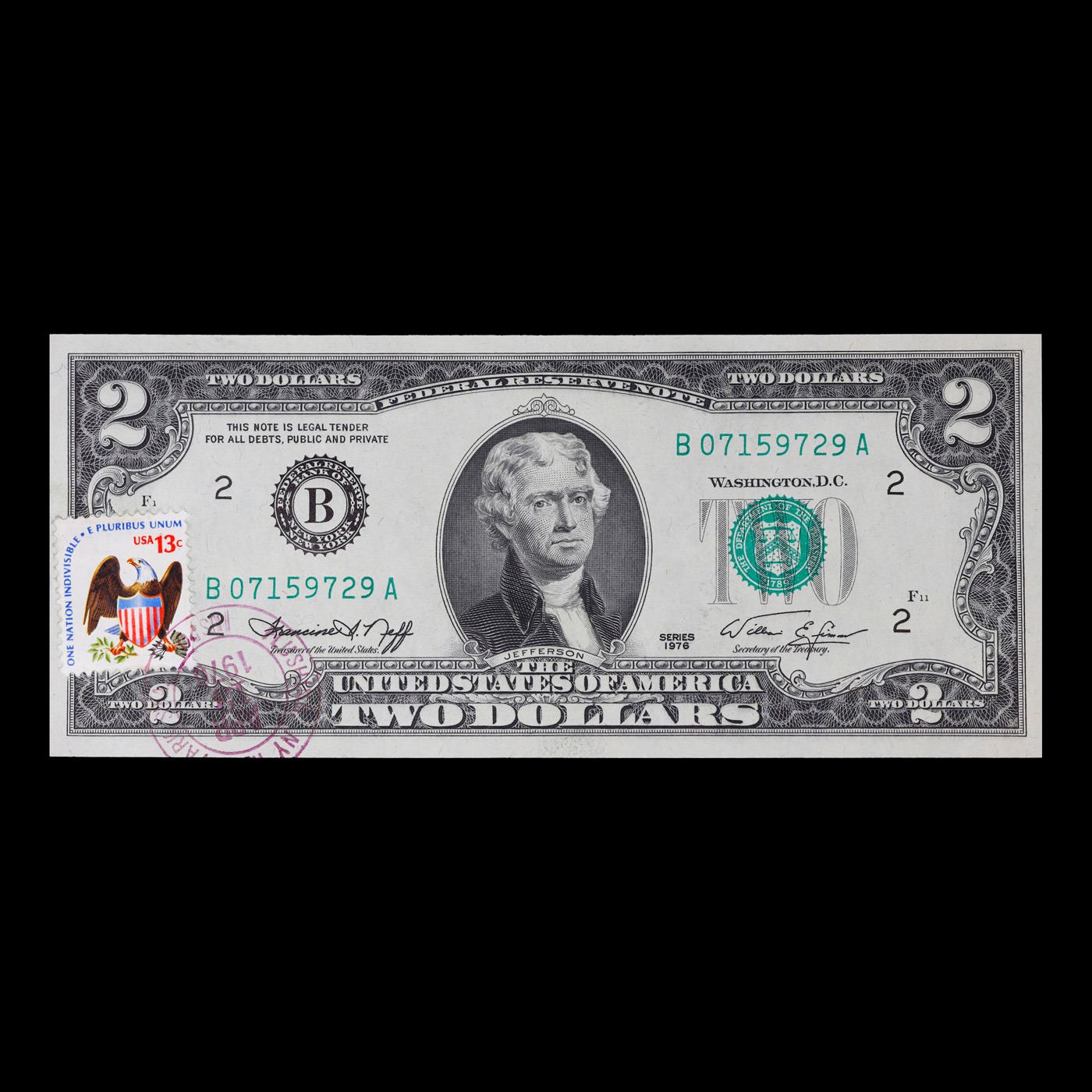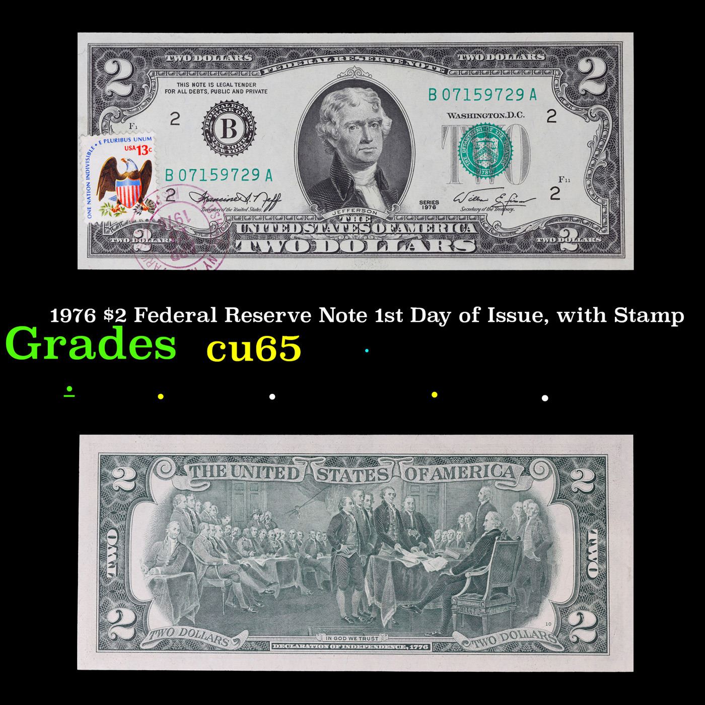 1976 $2 Federal Reserve Note 1st Day of Issue, with Stamp Grades Gem CU