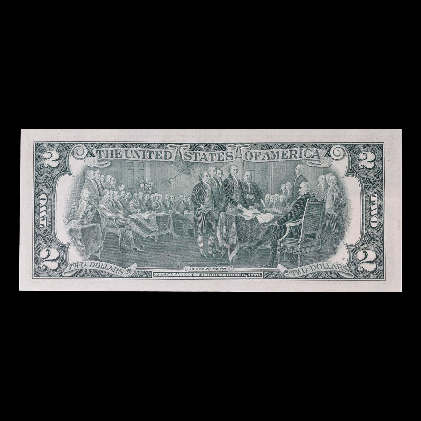 1976 $2 Federal Reserve Note 1st Day of Issue, with Stamp Grades Gem CU. On April 13, 1976, to celebrate the bicentennial of American independence, new $2 Federal Reserve Notes were issued with backs featuring the well-known painting Signing of the Declaration of Independence. These Notes all have a 13c Stamp or 2 stamps totaling 13c hand canceled on April 13, 1976 for the first day of issue of the new $2 notes. These official first-day-of-issue Bicentennial notes will be historic additions to your collection (designs and locations of the 13¢ stamps will vary).