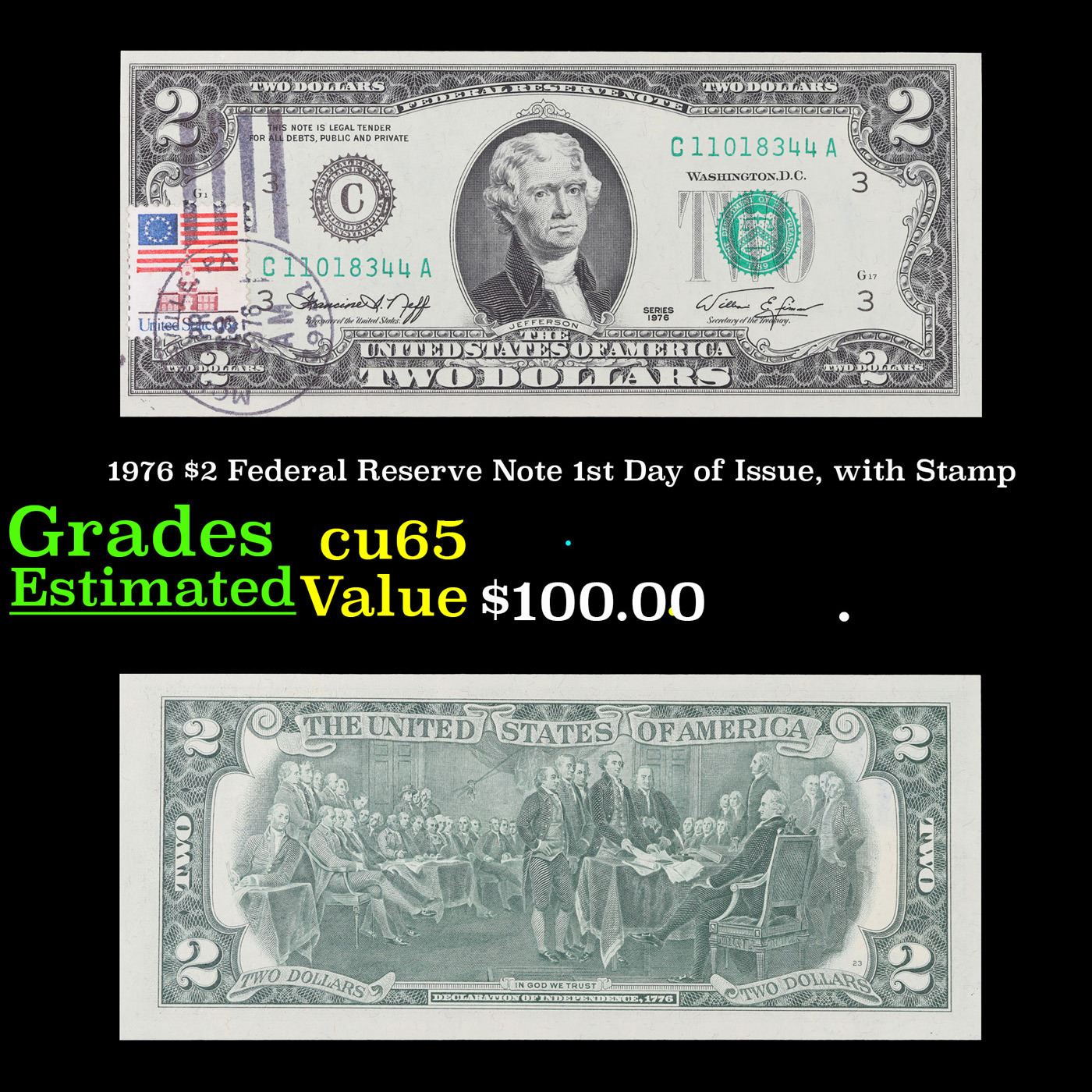 1976 $2 Federal Reserve Note 1st Day of Issue, with Stamp Grades Gem CU