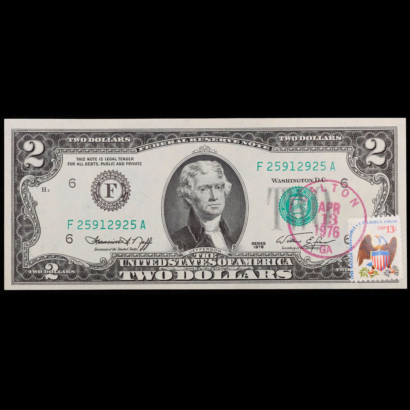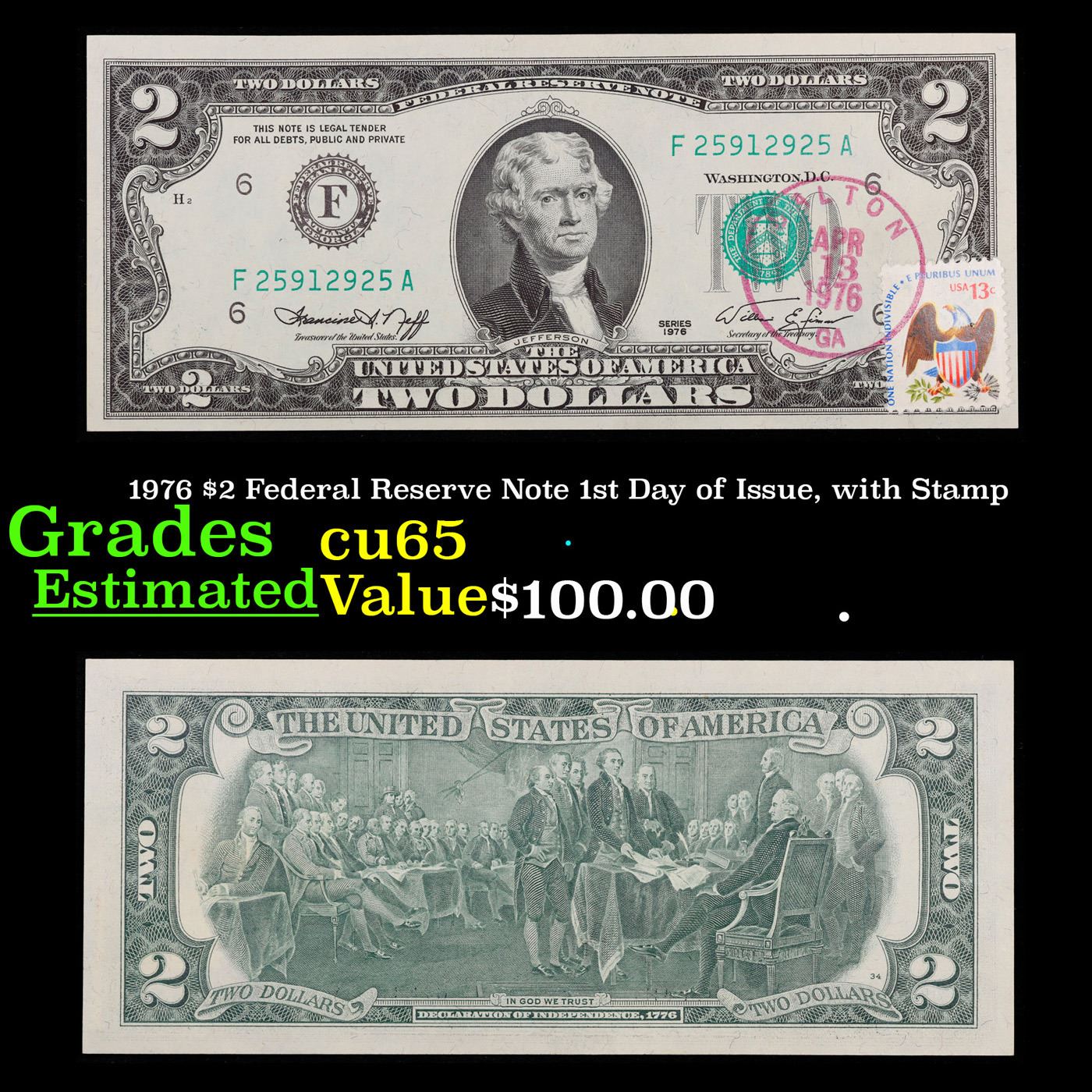 1976 $2 Federal Reserve Note 1st Day of Issue, with Stamp Grades Gem CU