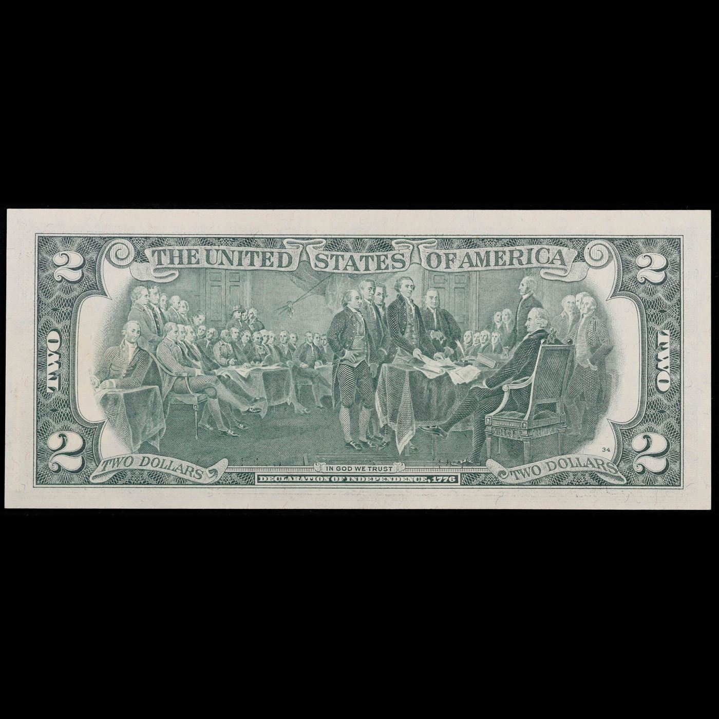 1976 $2 Federal Reserve Note 1st Day of Issue, with Stamp Grades Gem CU. On April 13, 1976, to celebrate the bicentennial of American independence, new $2 Federal Reserve Notes were issued with backs featuring the well-known painting Signing of the Declaration of Independence. These Notes all have a 13c Stamp or 2 stamps totaling 13c hand canceled on April 13, 1976 for the first day of issue of the new $2 notes. These official first-day-of-issue Bicentennial notes will be historic additions to your collection (designs and locations of the 13¢ stamps will vary).