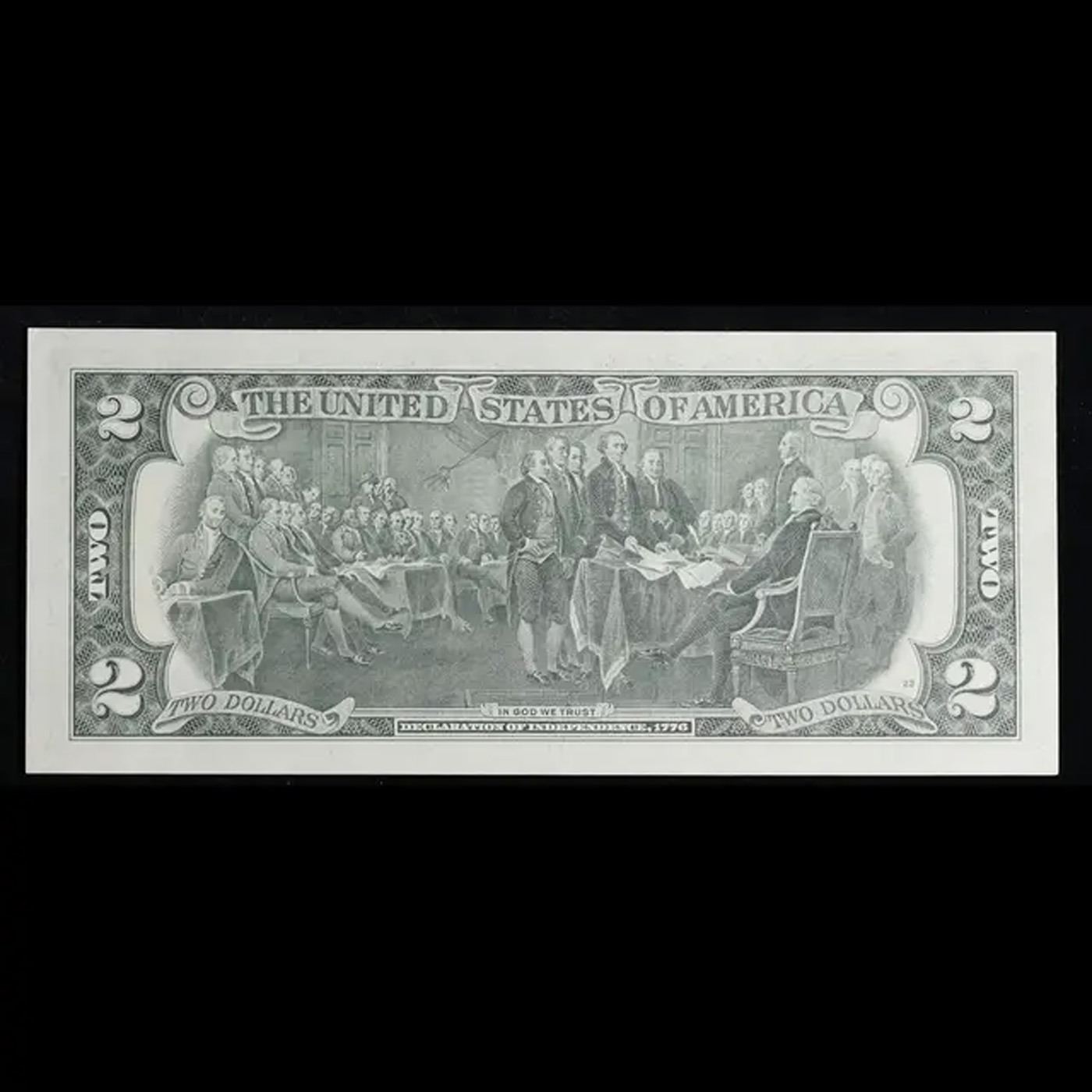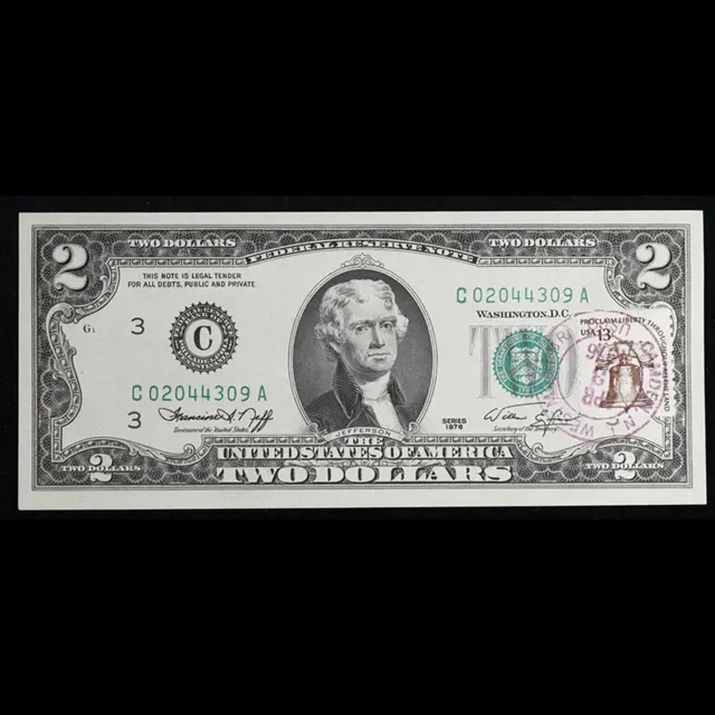 1976 $2 Federal Reserve Note 1st Day of Issue, with Stamp Grades Gem CU. On April 13, 1976, to celebrate the bicentennial of American independence, new $2 Federal Reserve Notes were issued with backs featuring the well-known painting Signing of the Declaration of Independence. These Notes all have a 13c Stamp or 2 stamps totaling 13c hand canceled on April 13, 1976 for the first day of issue of the new $2 notes. These official first-day-of-issue Bicentennial notes will be historic additions to your collection (designs and locations of the 13¢ stamps will vary).
