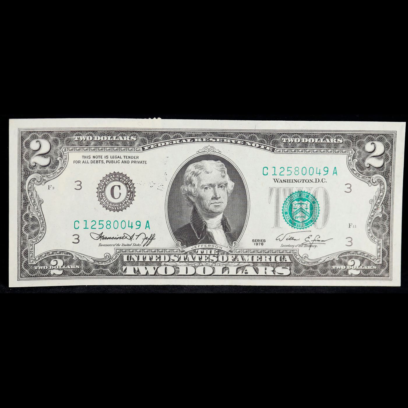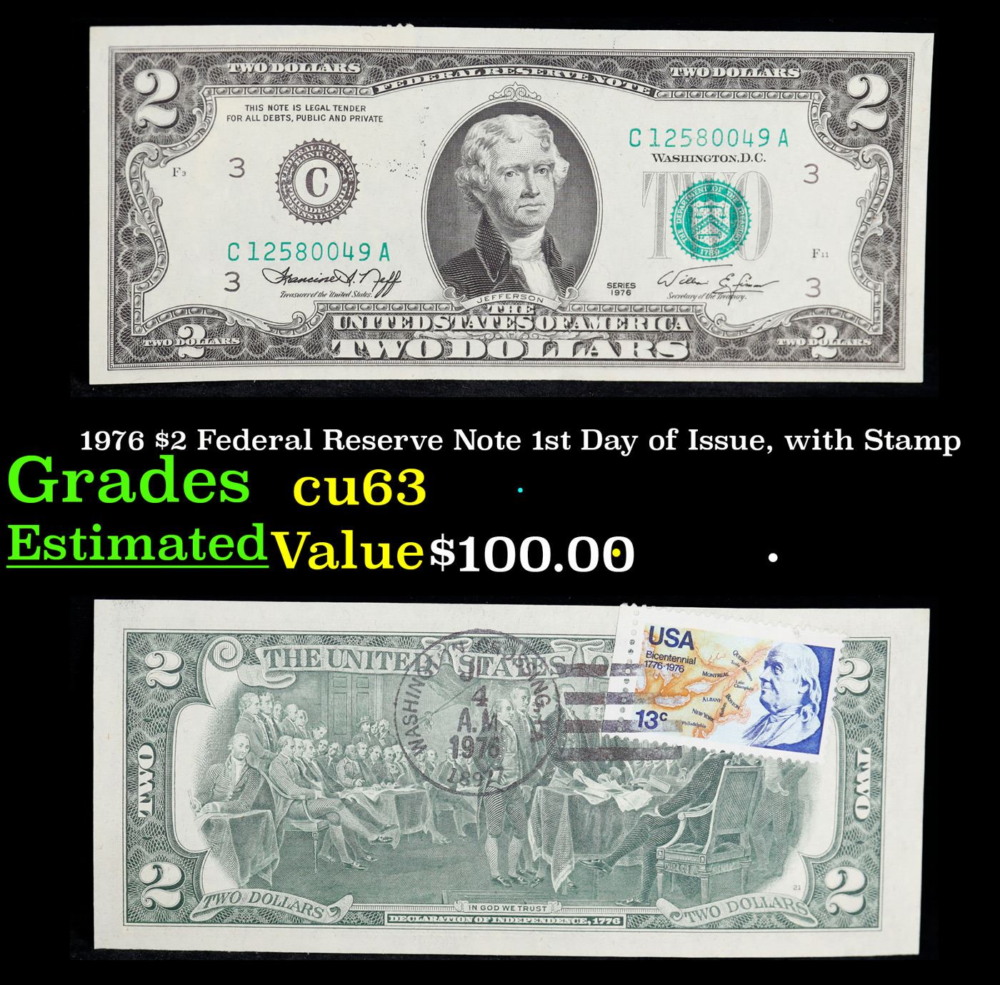 1976 $2 Federal Reserve Note 1st Day of Issue, with Stamp Grades Select CU
