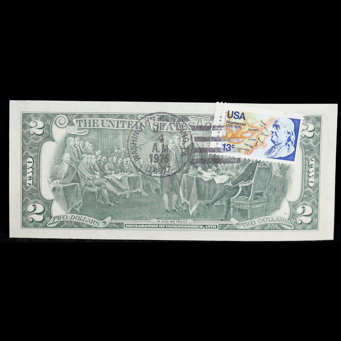 1976 $2 Federal Reserve Note 1st Day of Issue, with Stamp Grades Select CU. On April 13, 1976, to celebrate the bicentennial of American independence, new $2 Federal Reserve Notes were issued with backs featuring the well-known painting Signing of the Declaration of Independence. These Notes all have a 13c Stamp or 2 stamps totaling 13c hand canceled on April 13, 1976 for the first day of issue of the new $2 notes. These official first-day-of-issue Bicentennial notes will be historic additions to your collection (designs and locations of the 13¢ stamps will vary).