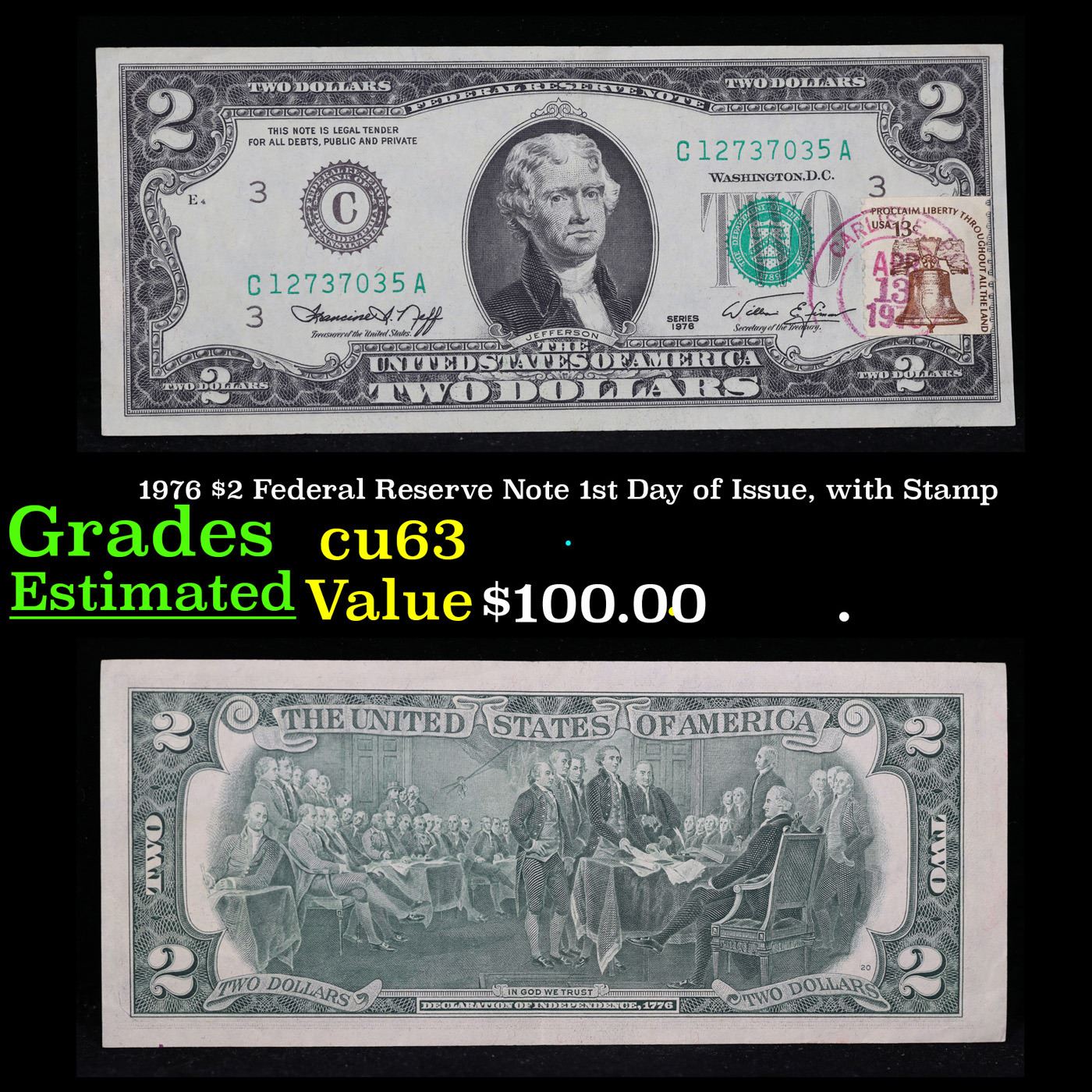 1976 $2 Federal Reserve Note 1st Day of Issue, with Stamp Grades Select CU. On April 13, 1976, to celebrate the bicentennial of American independence, new $2 Federal Reserve Notes were issued with backs featuring the well-known painting Signing of the Declaration of Independence. These Notes all have a 13c Stamp or 2 stamps totaling 13c hand canceled on April 13, 1976 for the first day of issue of the new $2 notes. These official first-day-of-issue Bicentennial notes will be historic additions to your collection (designs and locations of the 13¢ stamps will vary).