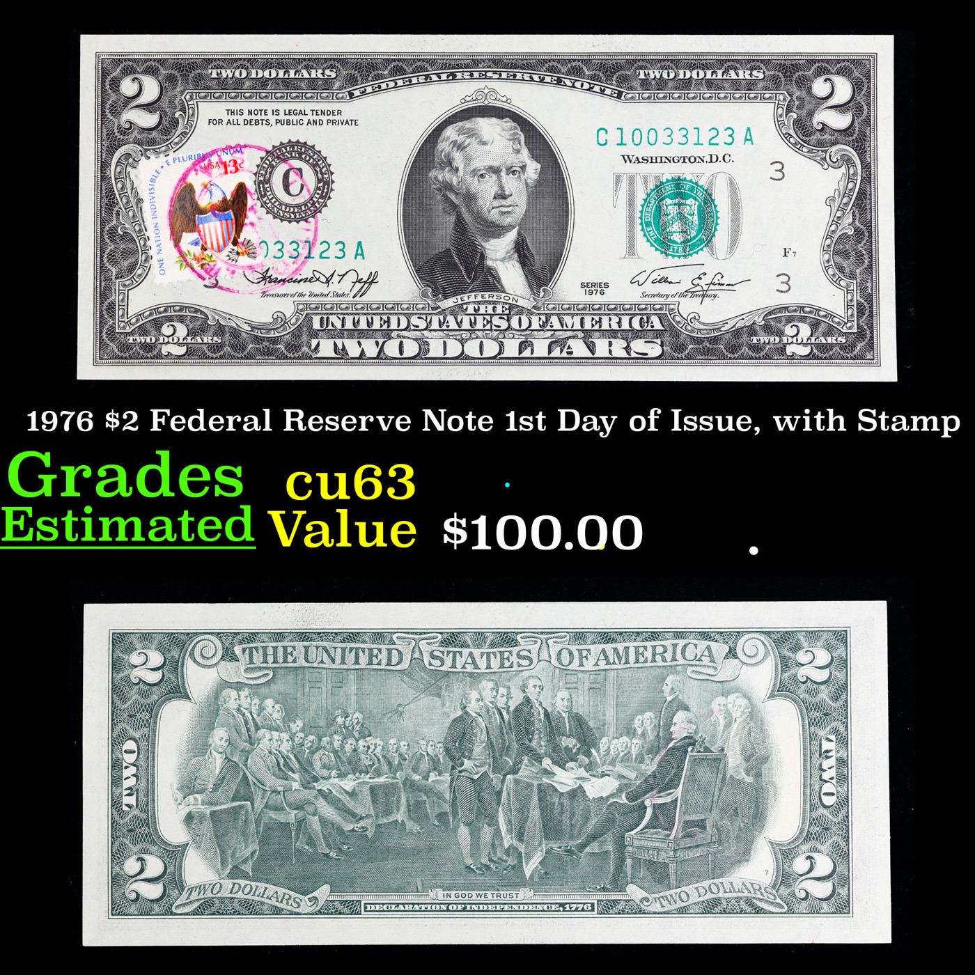 1976 $2 Federal Reserve Note 1st Day of Issue, with Stamp Grades Select CU.