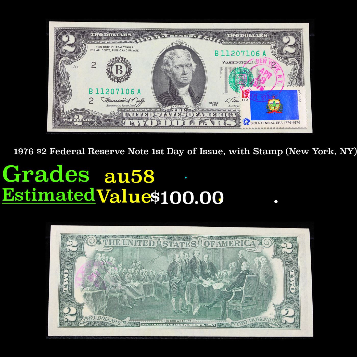 1976 $2 Federal Reserve Note 1st Day of Issue, with Stamp (New York, NY) Grades Choice AU/BU Slider.