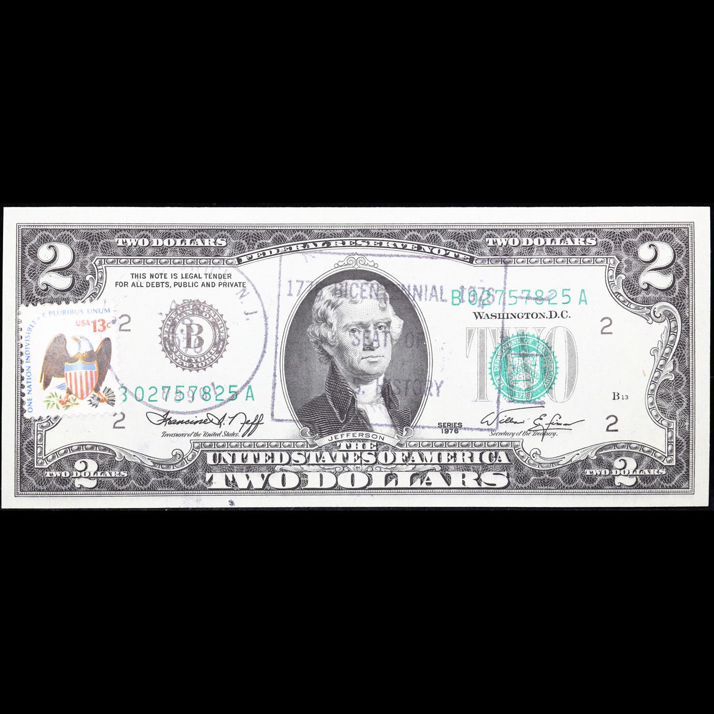 1976 $2 Federal Reserve Note 1st Day of Issue, with Stamp (New York, NY) Grades Gem CU. On April 13, 1976, to celebrate the bicentennial of American independence, new $2 Federal Reserve Notes were issued with backs featuring the well-known painting Signing of the Declaration of Independence. These Notes all have a 13c Stamp or 2 stamps totaling 13c hand canceled on April 13, 1976 for the first day of issue of the new $2 notes. These official first-day-of-issue Bicentennial notes will be historic additions to your collection (designs and locations of the 13¢ stamps will vary).