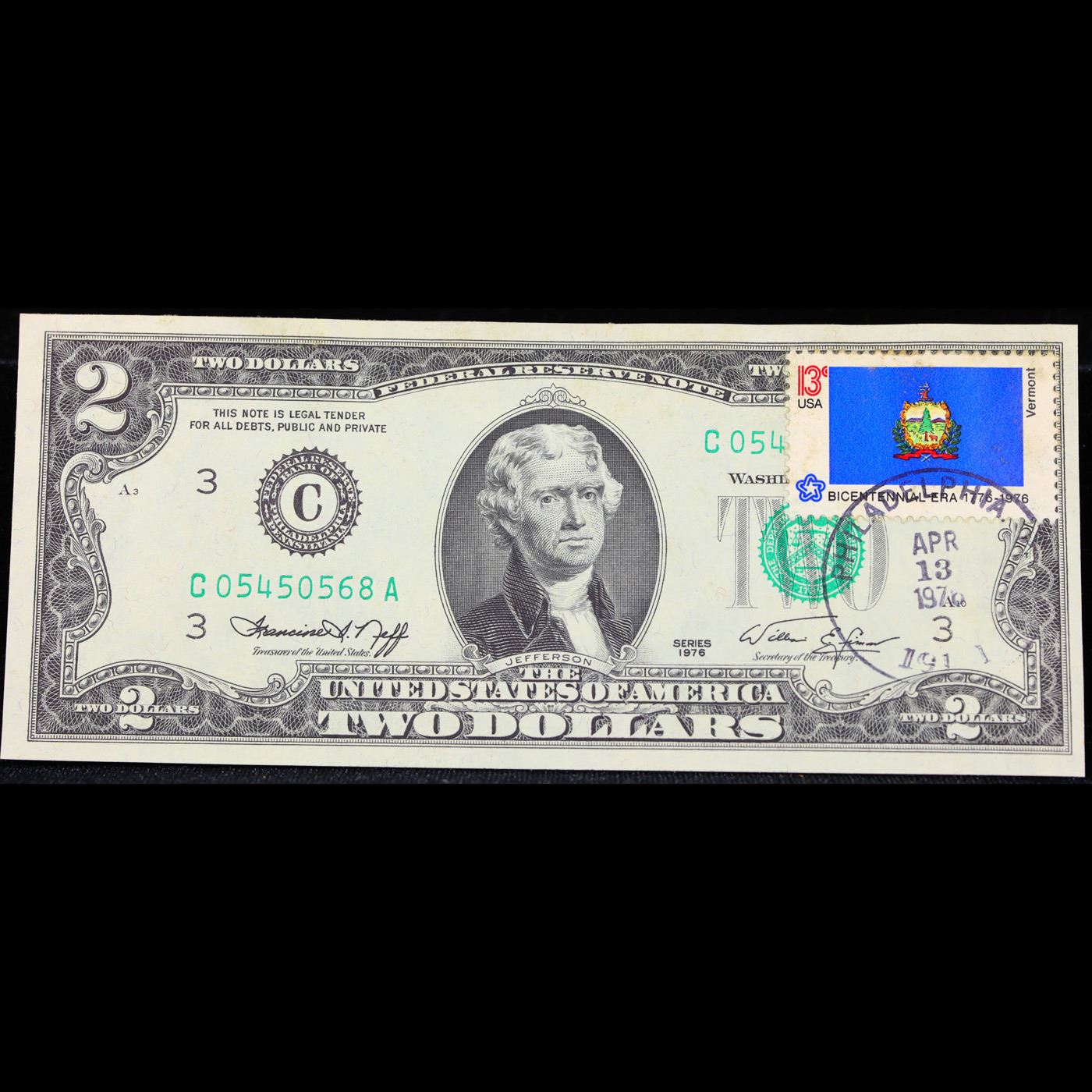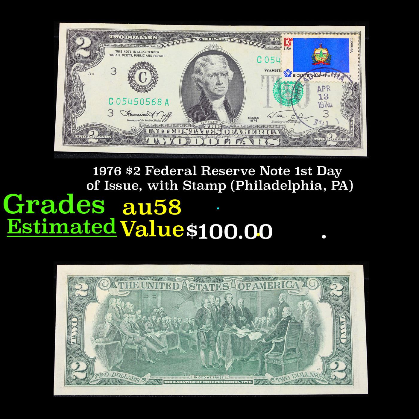 1976 $2 Federal Reserve Note 1st Day of Issue, with Stamp (Philadelphia, PA) Grades Choice AU/BU Slider.
