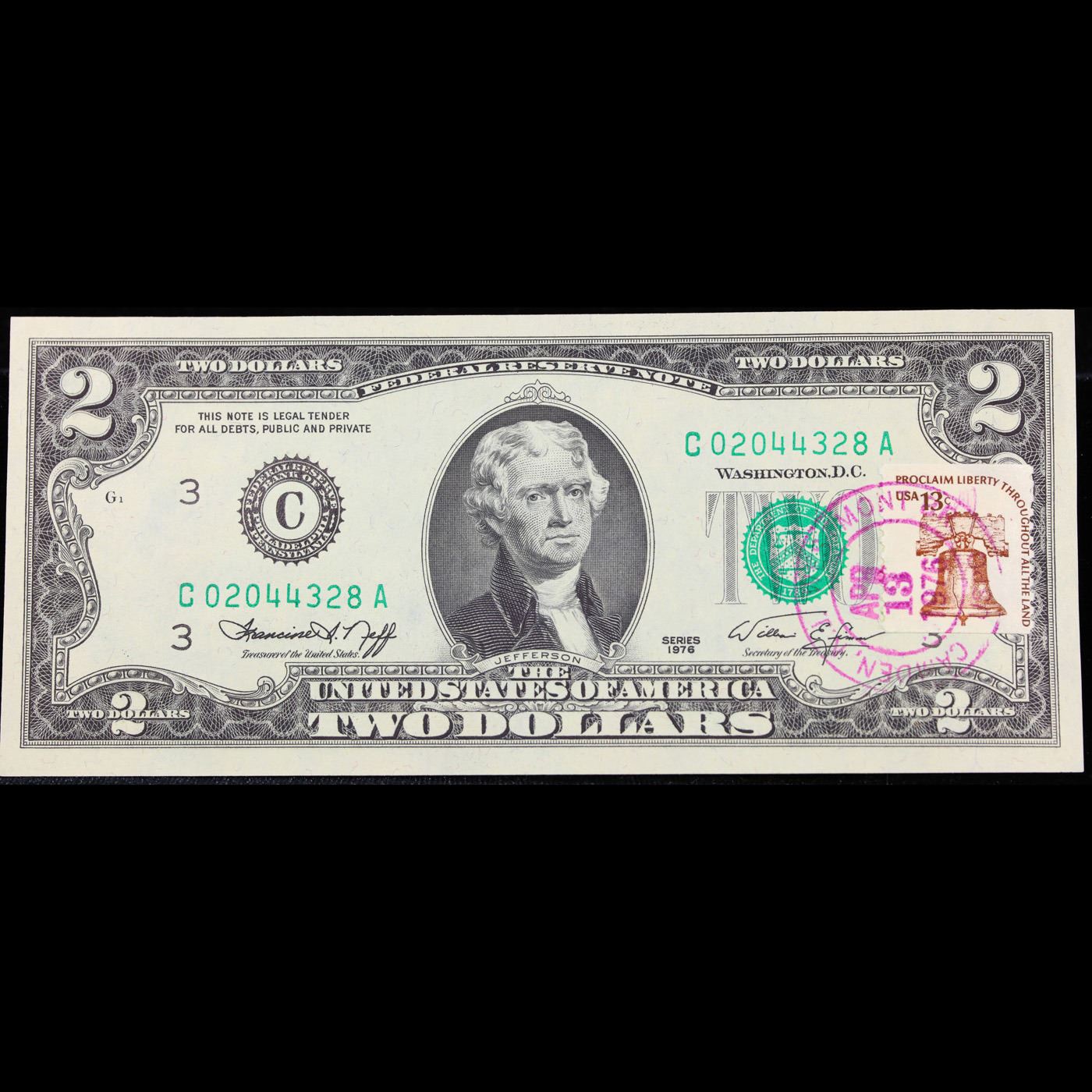 1976 $2 Federal Reserve Note 1st Day of Issue, with Stamp (Philadelphia, PA) Grades Gem CU