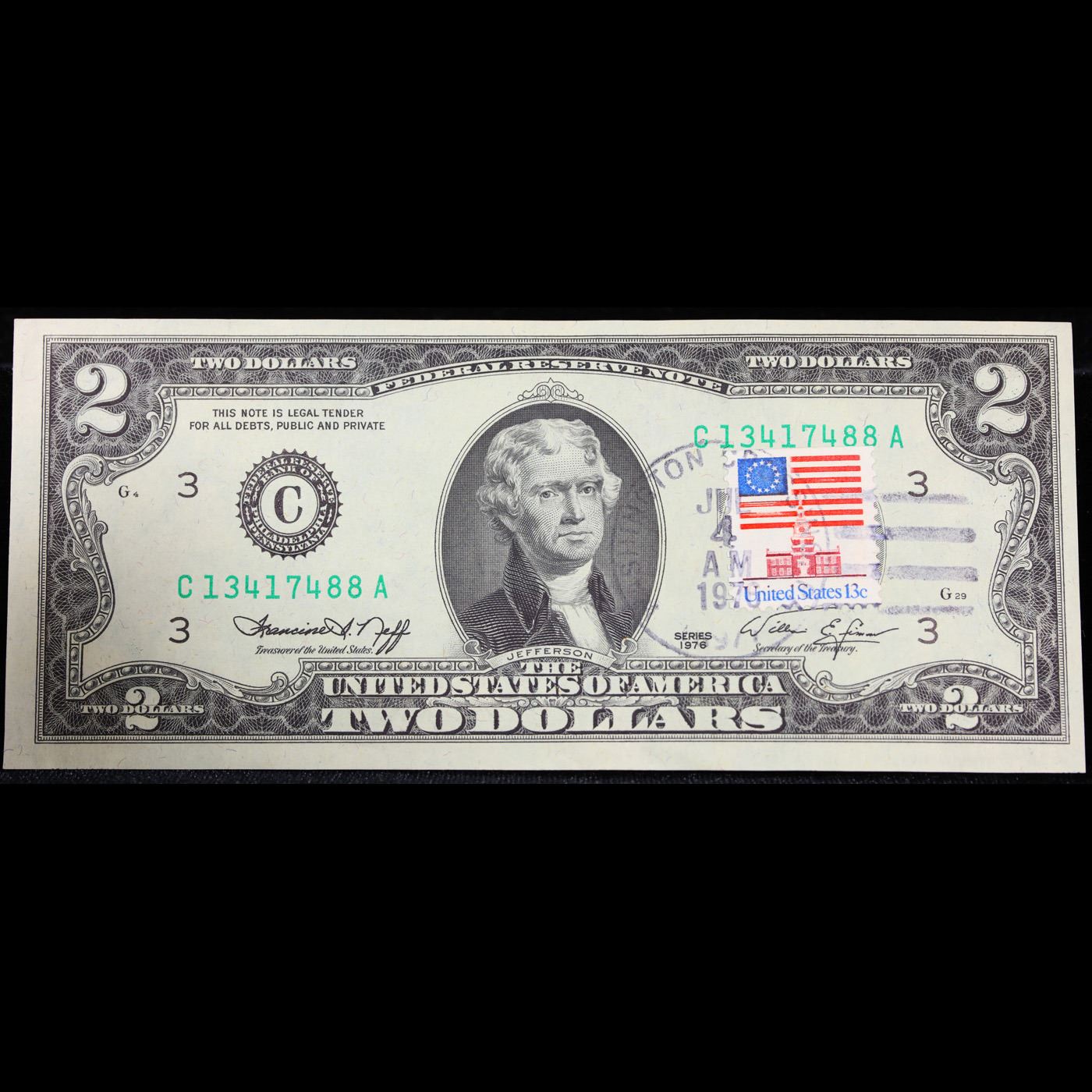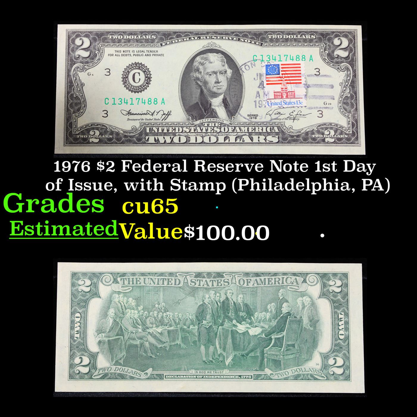 1976 $2 Federal Reserve Note 1st Day of Issue, with Stamp (Philadelphia, PA) Grades Gem CU.