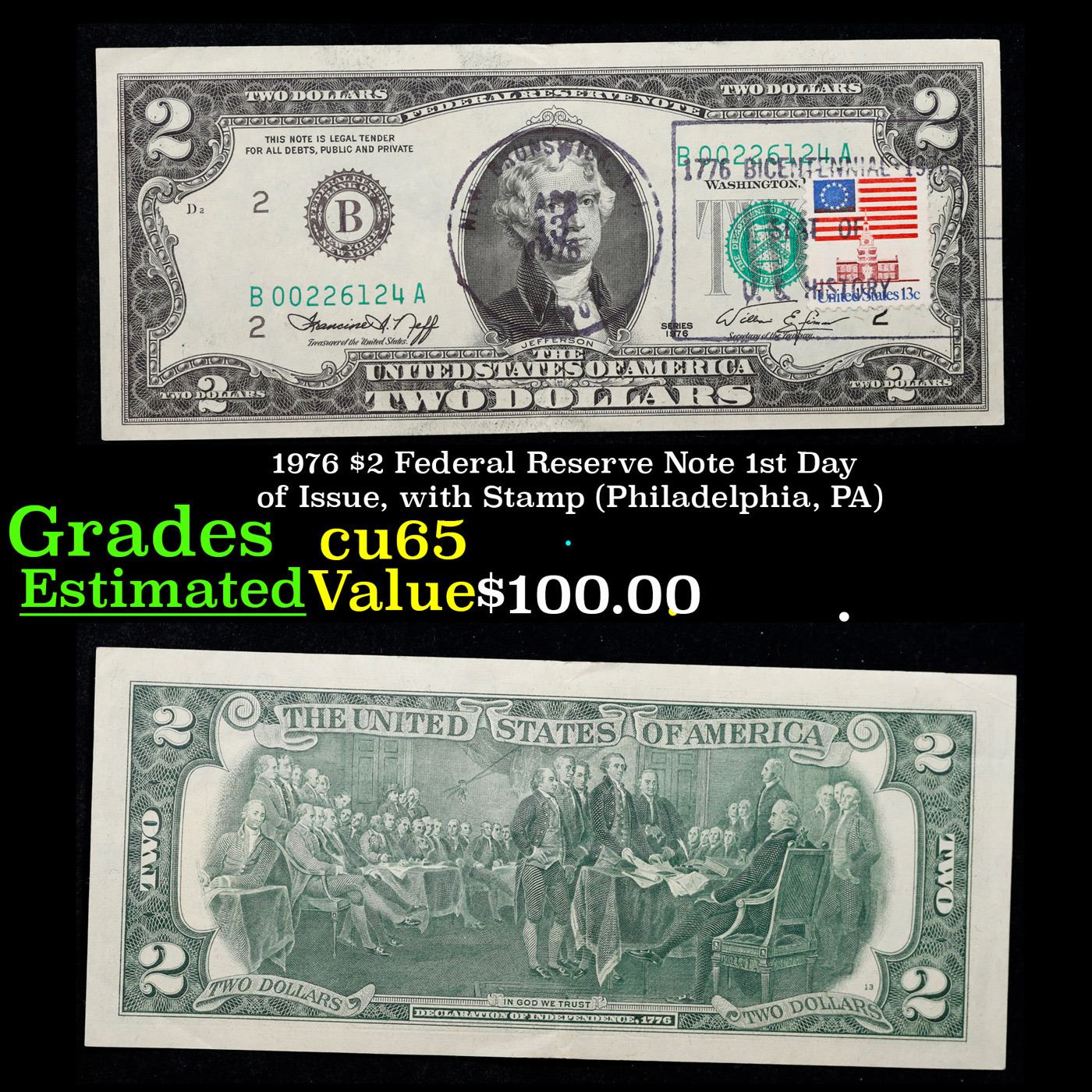 1976 $2 Federal Reserve Note 1st Day of Issue, with Stamp (Philadelphia, PA) Grades Gem CU