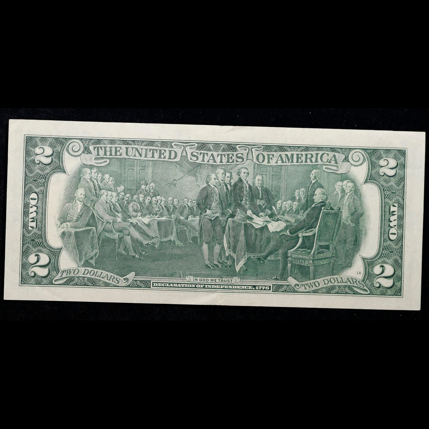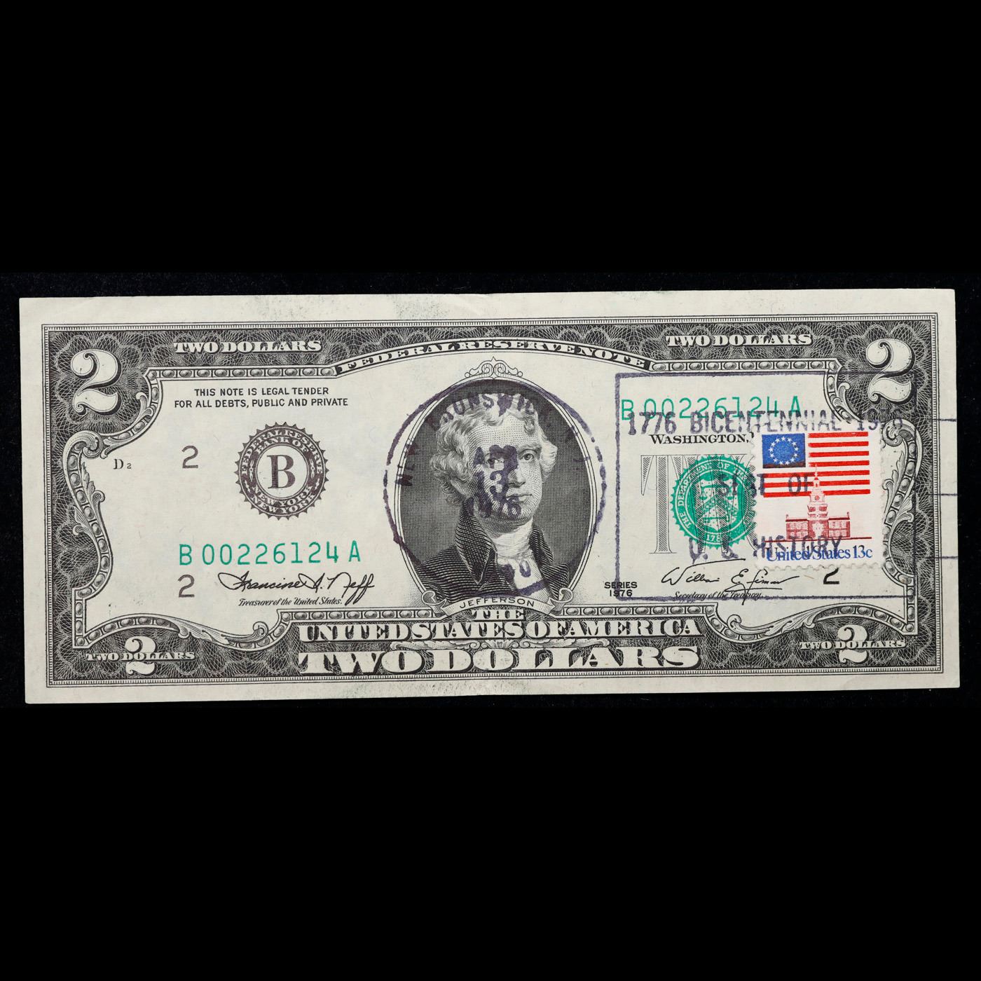 1976 $2 Federal Reserve Note 1st Day of Issue, with Stamp (Philadelphia, PA) Grades Gem CU. On April 13, 1976, to celebrate the bicentennial of American independence, new $2 Federal Reserve Notes were issued with backs featuring the well-known painting Signing of the Declaration of Independence. These Notes all have a 13c Stamp or 2 stamps totaling 13c hand canceled on April 13, 1976 for the first day of issue of the new $2 notes. These official first-day-of-issue Bicentennial notes will be historic additions to your collection (designs and locations of the 13¢ stamps will vary).