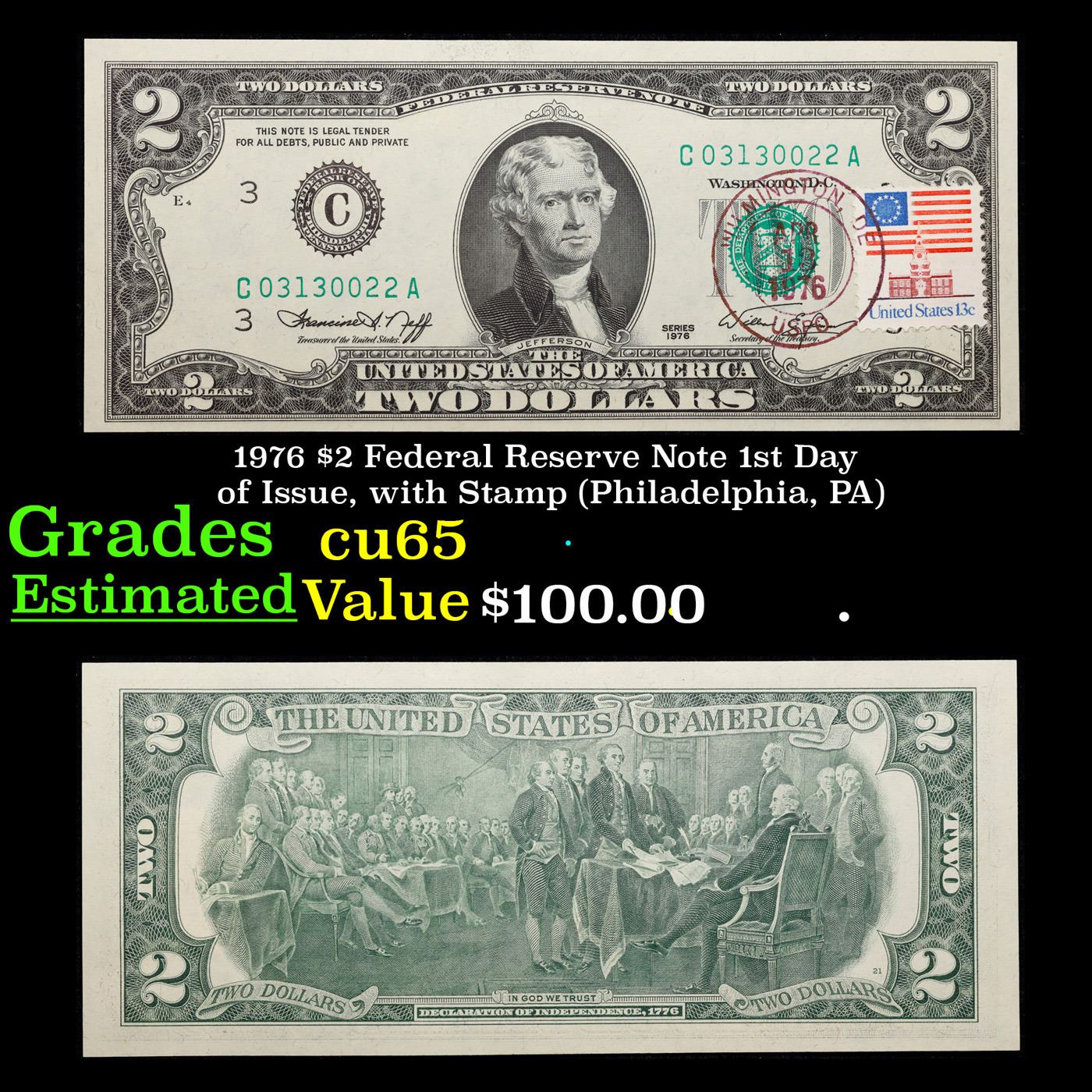 1976 $2 Federal Reserve Note 1st Day of Issue, with Stamp (Philadelphia, PA) Grades Gem CU
