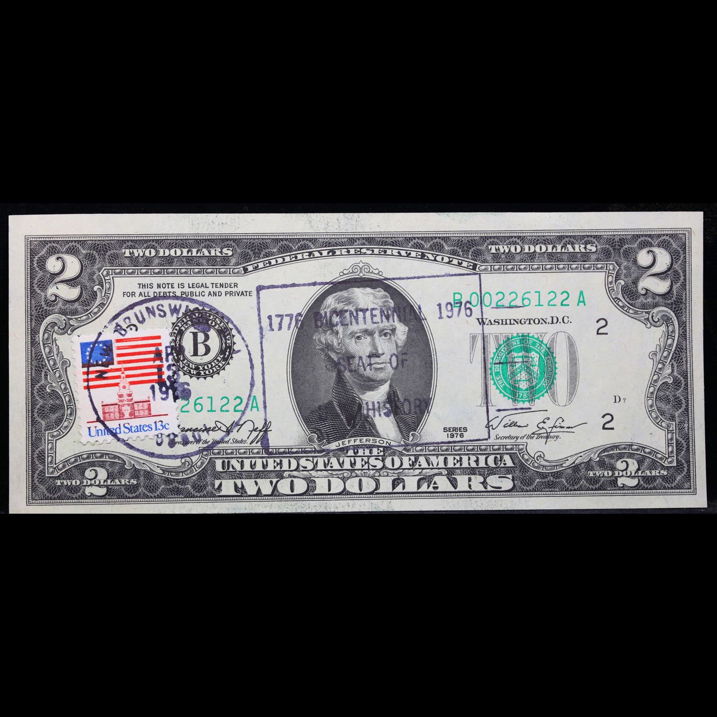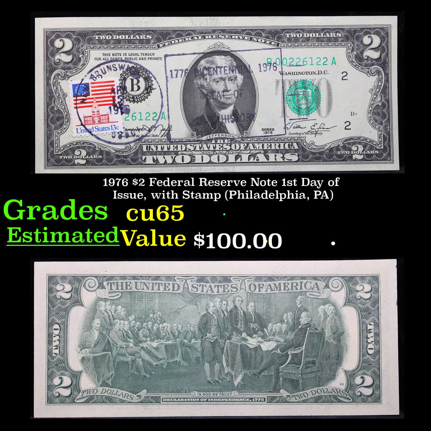 1976 $2 Federal Reserve Note 1st Day of Issue, with Stamp (Philadelphia, PA) Grades Gem CU. On April 13, 1976, to celebrate the bicentennial of American independence, new $2 Federal Reserve Notes were issued with backs featuring the well-known painting Signing of the Declaration of Independence. These Notes all have a 13c Stamp or 2 stamps totaling 13c hand canceled on April 13, 1976 for the first day of issue of the new $2 notes. These official first-day-of-issue Bicentennial notes will be historic additions to your collection (designs and locations of the 13¢ stamps will vary).