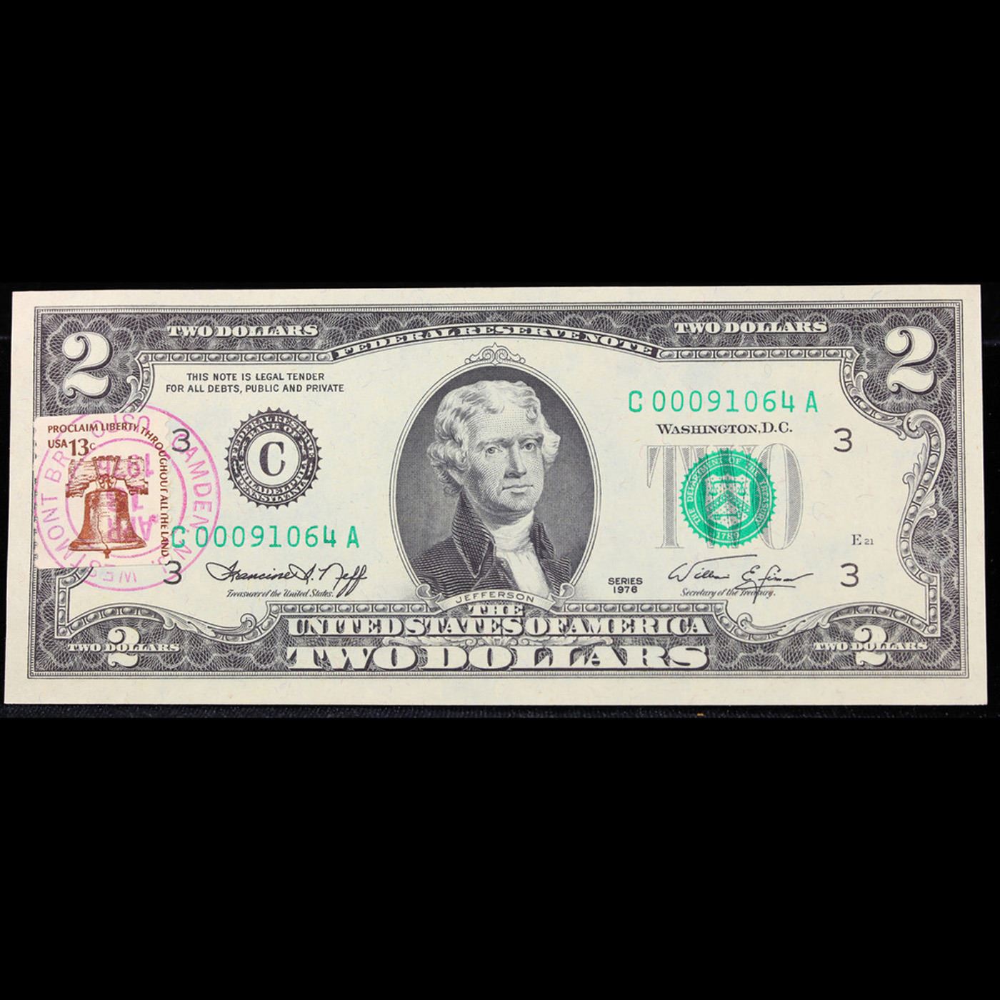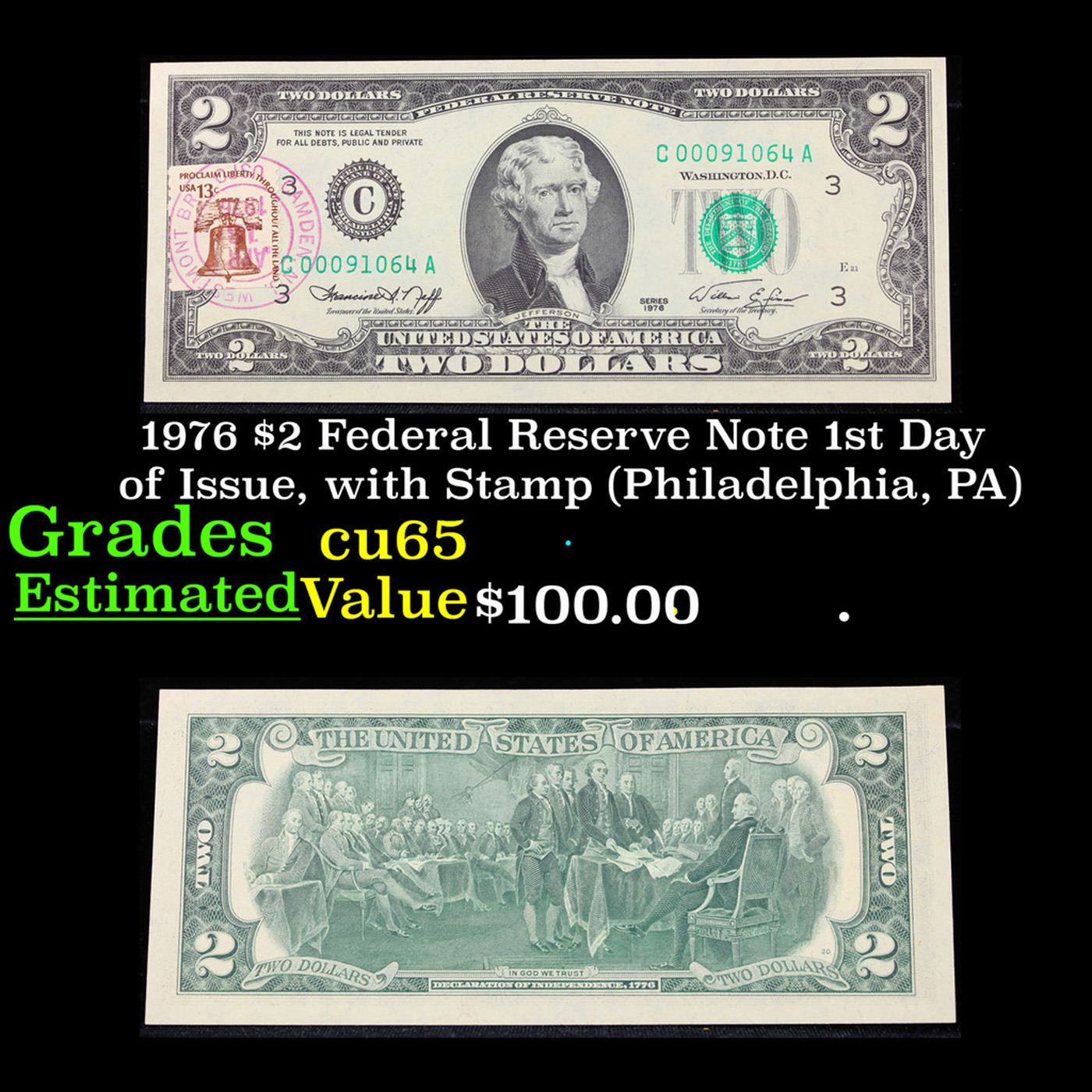 1976 $2 Federal Reserve Note 1st Day of Issue, with Stamp (Philadelphia, PA) Grades Gem CU.