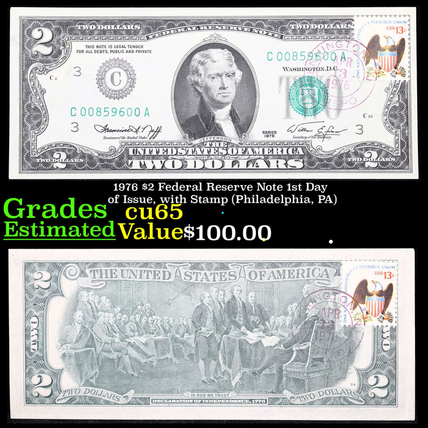1976 $2 Federal Reserve Note 1st Day of Issue, with Stamp (Philadelphia, PA) Grades Gem CU