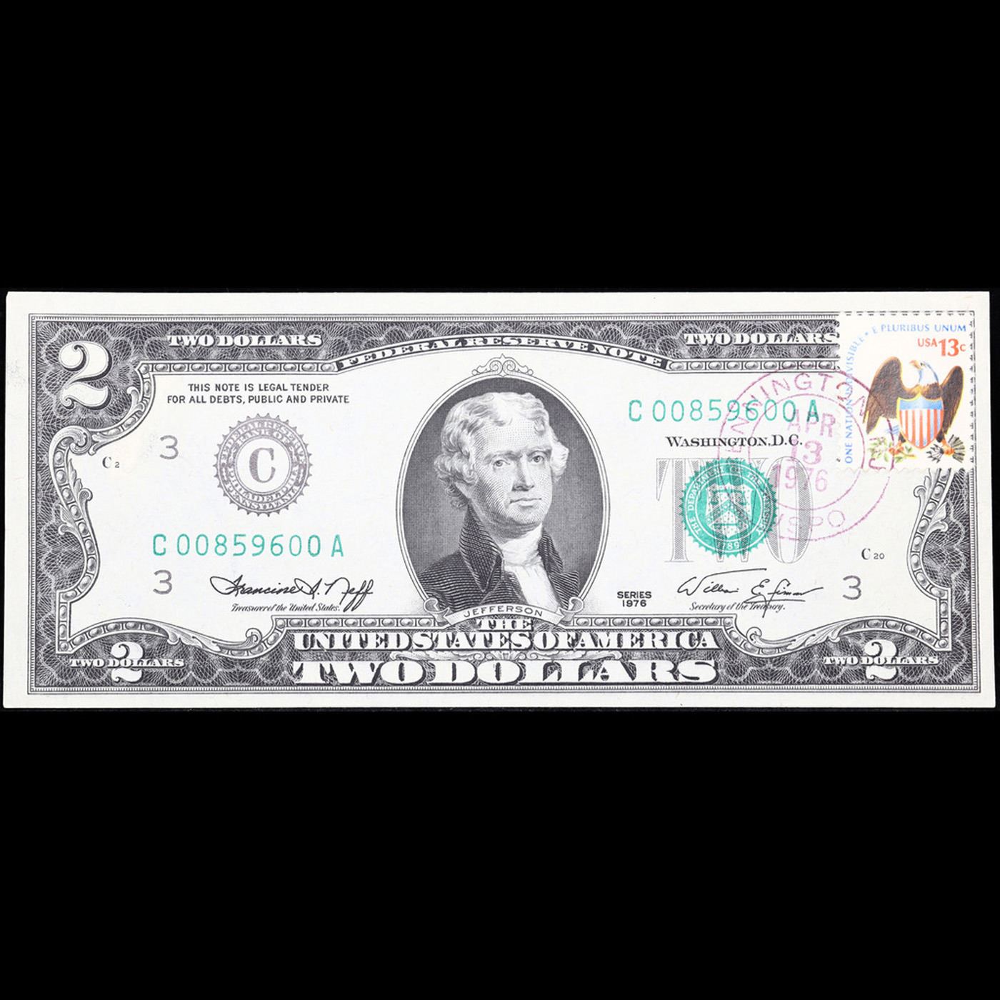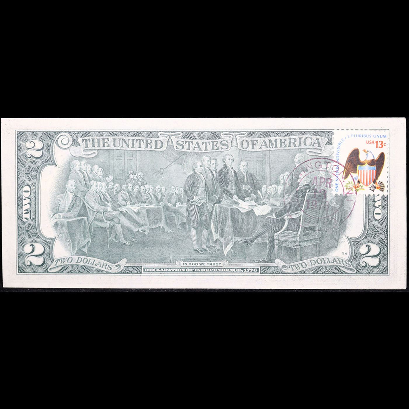 1976 $2 Federal Reserve Note 1st Day of Issue, with Stamp (Philadelphia, PA) Grades Gem CU. On April 13, 1976, to celebrate the bicentennial of American independence, new $2 Federal Reserve Notes were issued with backs featuring the well-known painting Signing of the Declaration of Independence. These Notes all have a 13c Stamp or 2 stamps totaling 13c hand canceled on April 13, 1976 for the first day of issue of the new $2 notes. These official first-day-of-issue Bicentennial notes will be historic additions to your collection (designs and locations of the 13¢ stamps will vary).