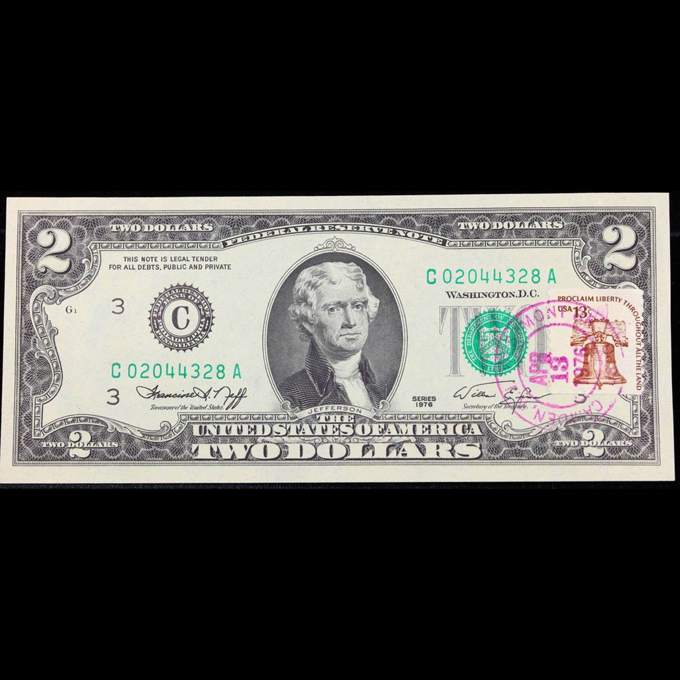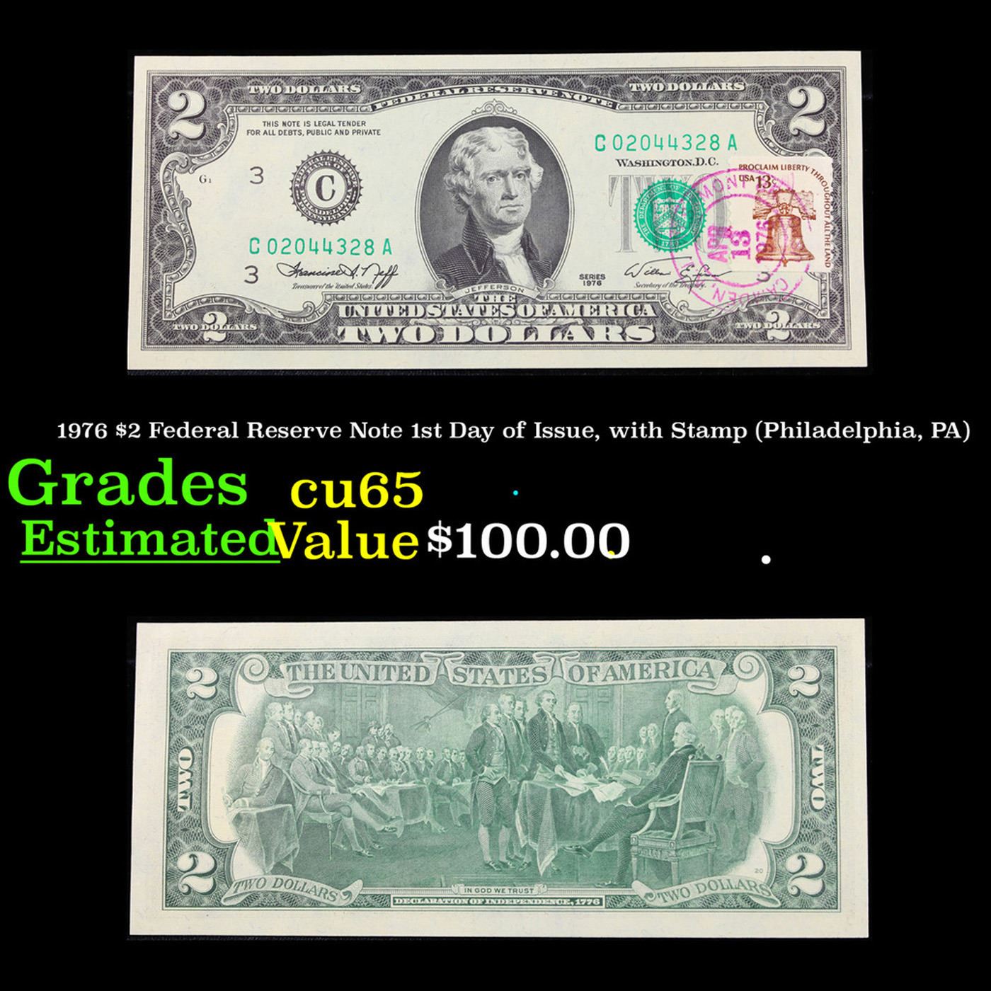 1976 $2 Federal Reserve Note 1st Day of Issue, with Stamp (Philadelphia, PA) Grades Gem CU.