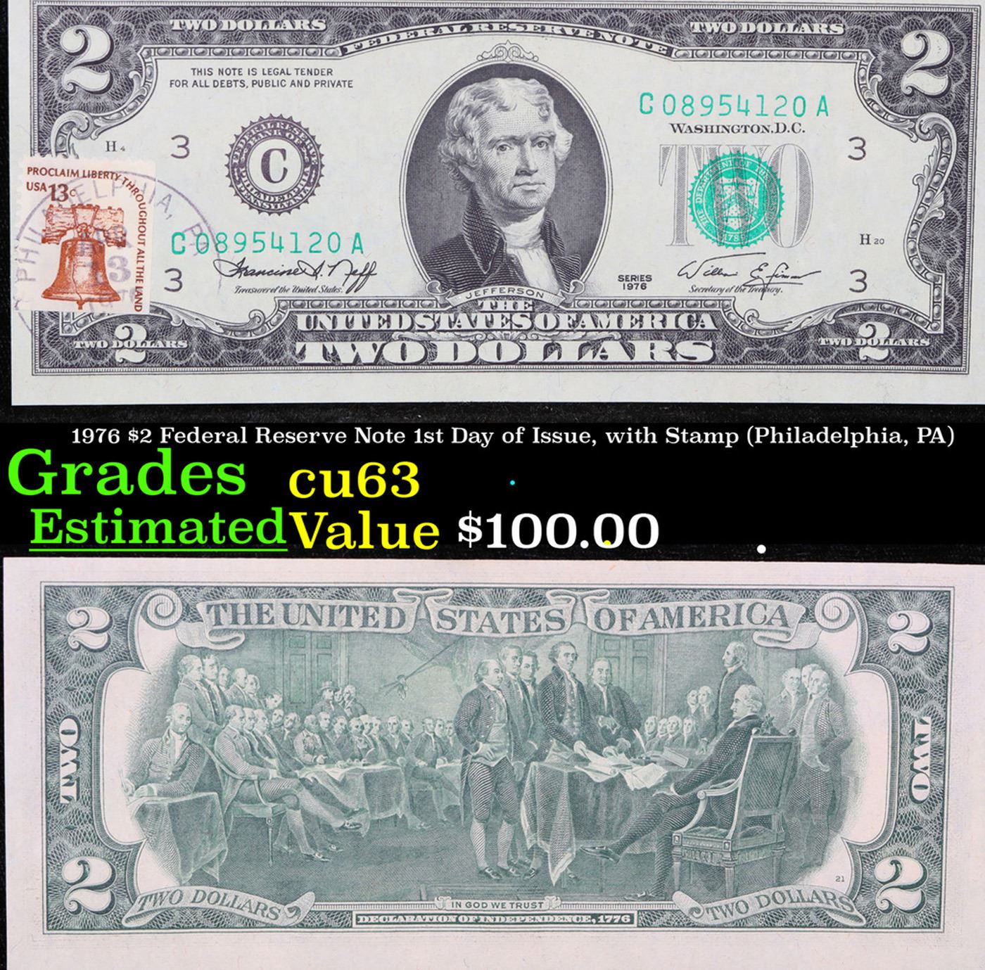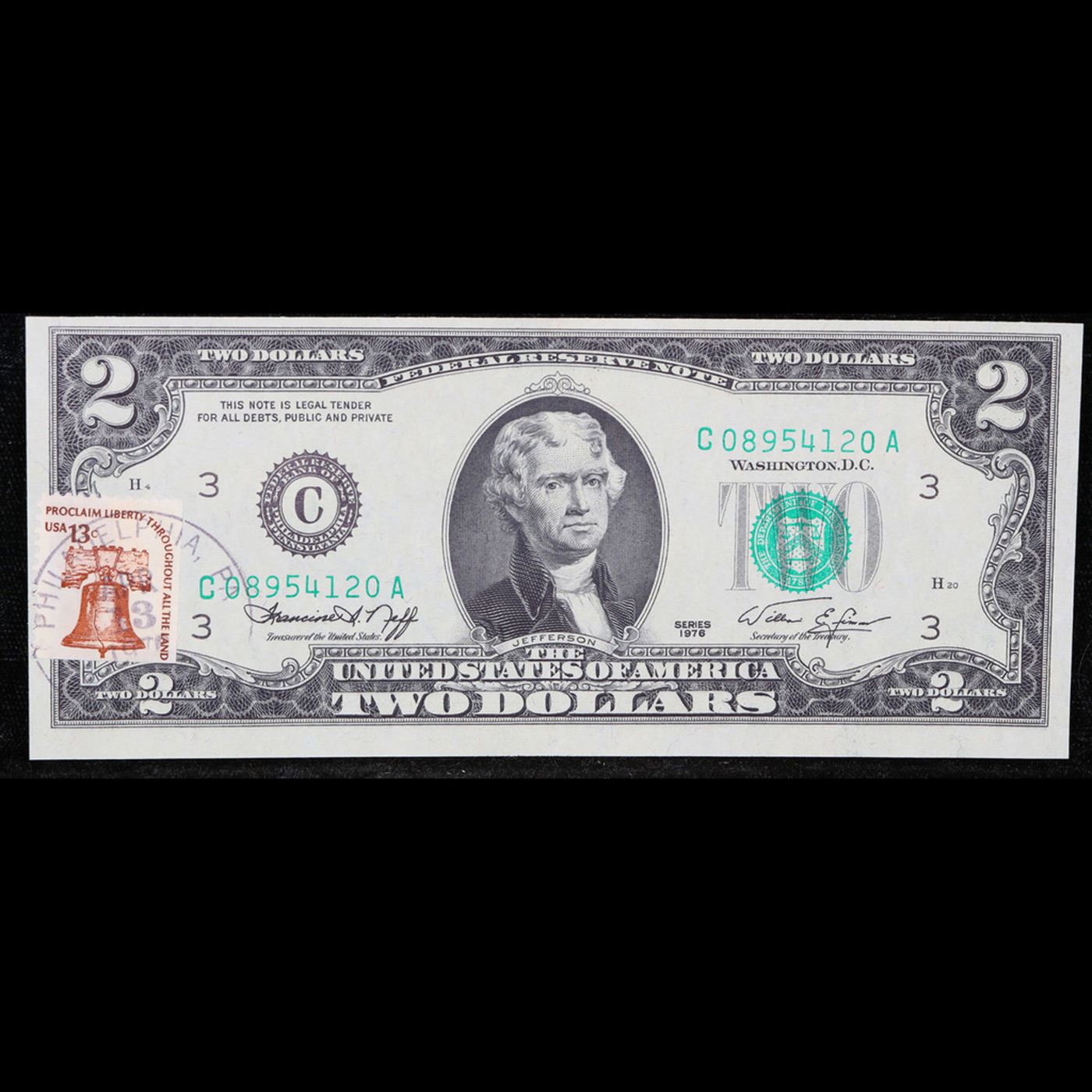 1976 $2 Federal Reserve Note 1st Day of Issue, with Stamp (Philadelphia, PA) Grades Select CU