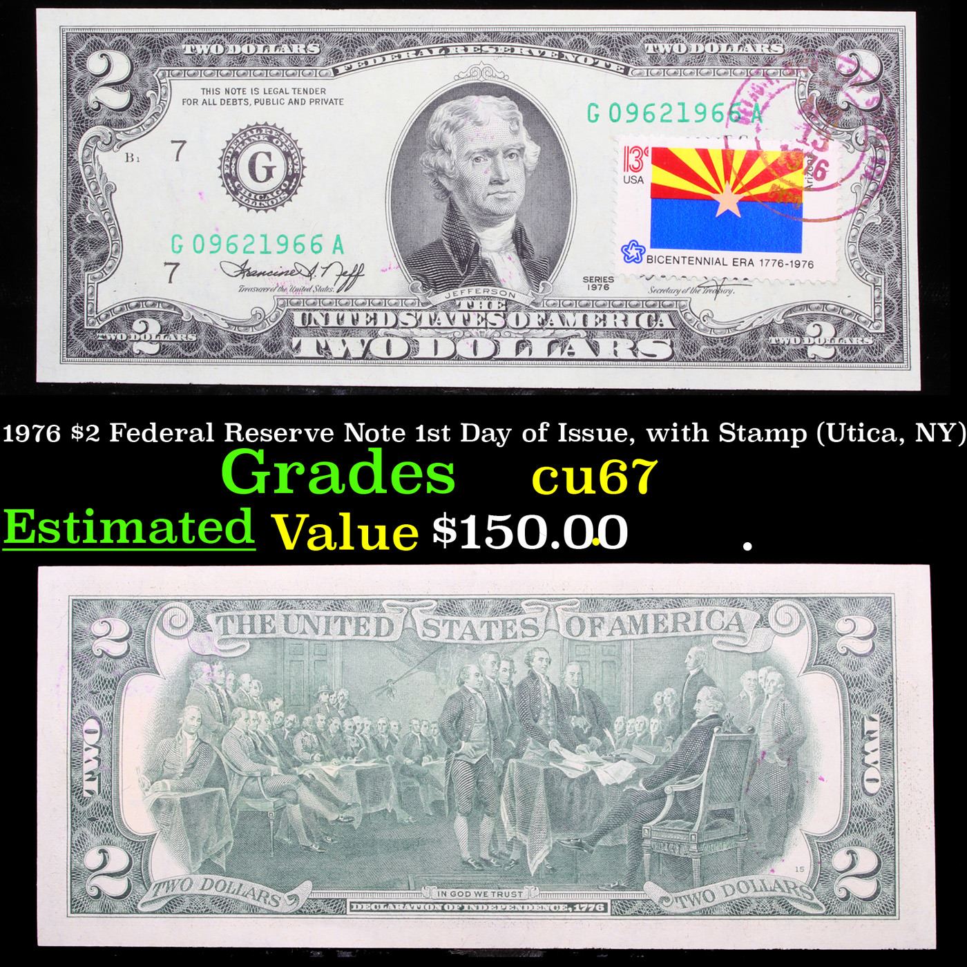 1976 $2 Federal Reserve Note 1st Day of Issue, with Stamp (Utica, NY) Grades Gem++ CU