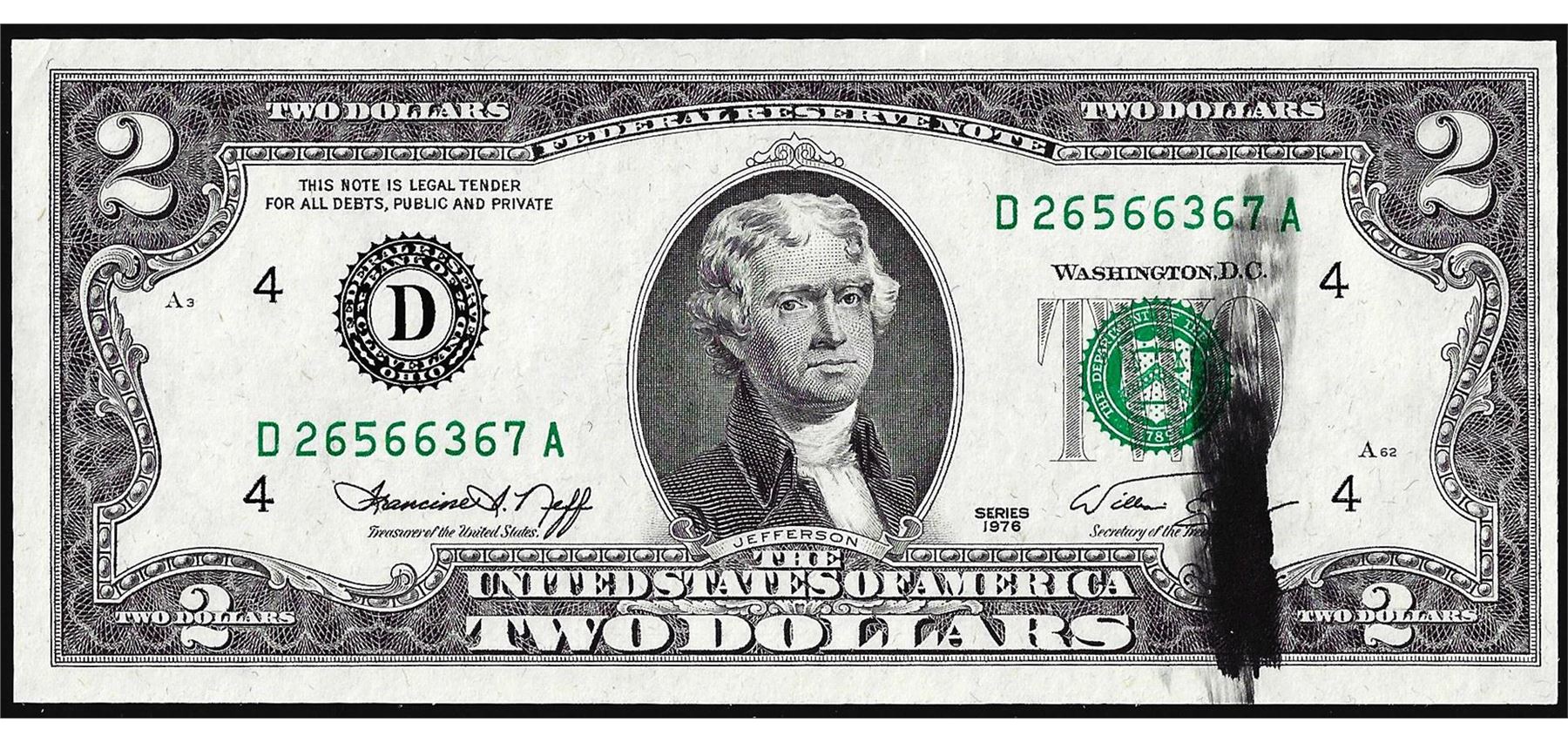 One 1976 $2 Federal Reserve Note Ink Smear ERROR.