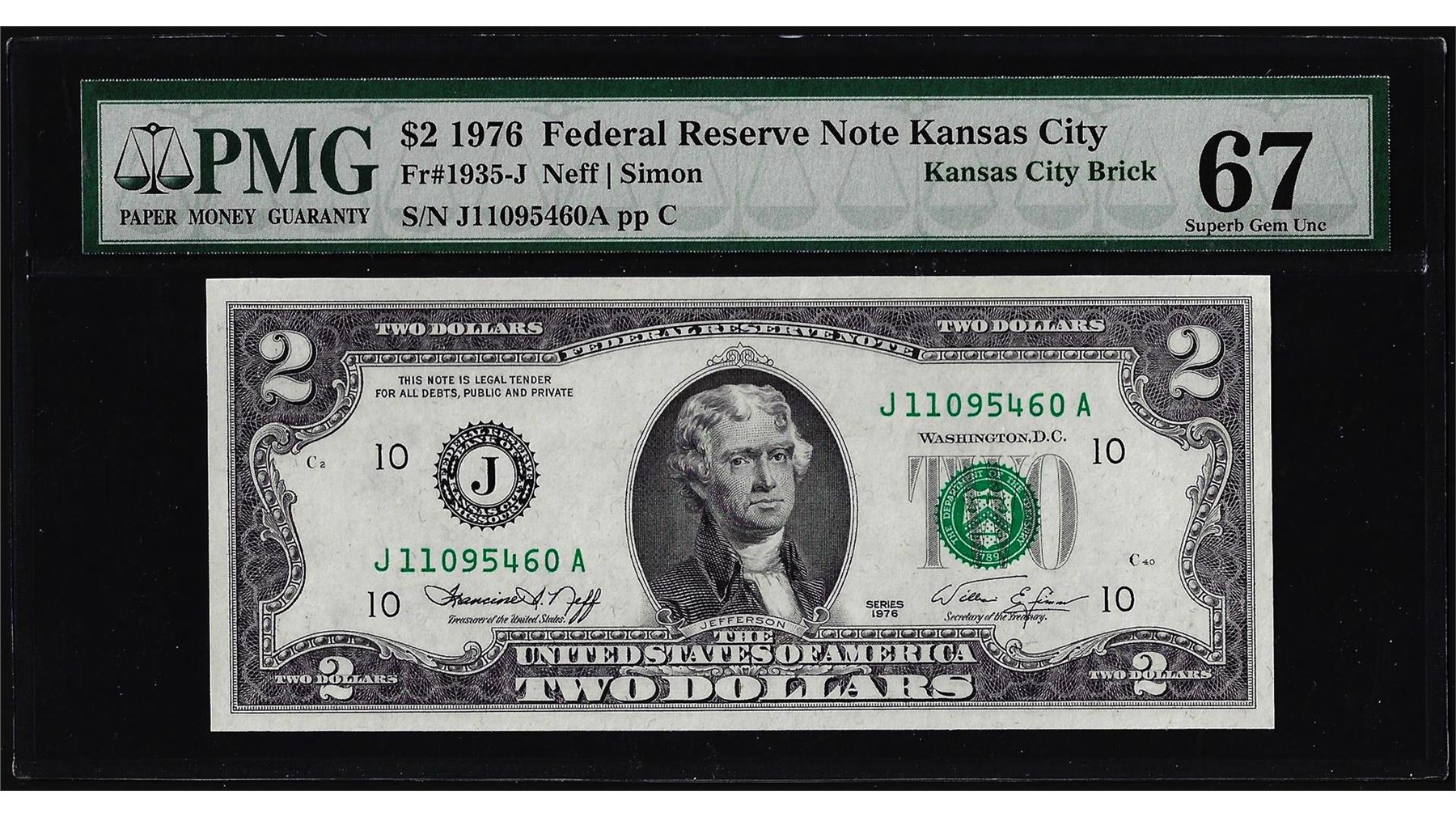 One 1976 $2 Federal Reserve Note Kansas City Fr.1935-J PMG Superb Gem Uncirculated 67. PMG Certified.