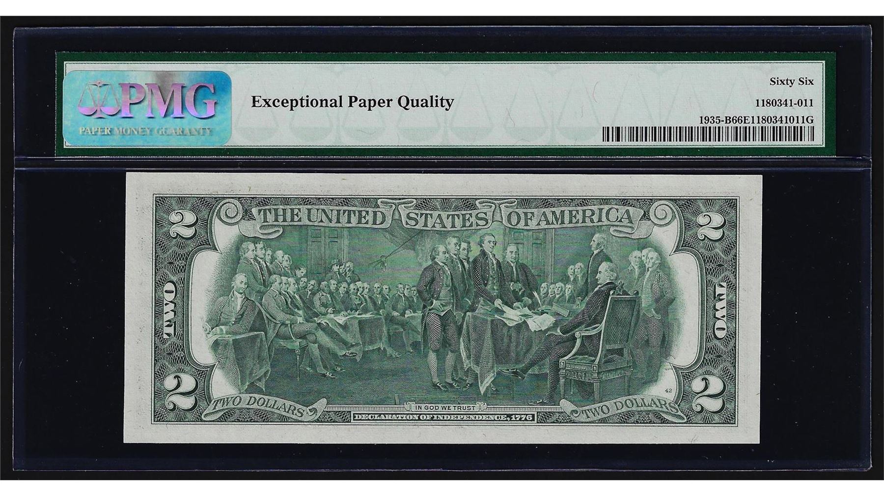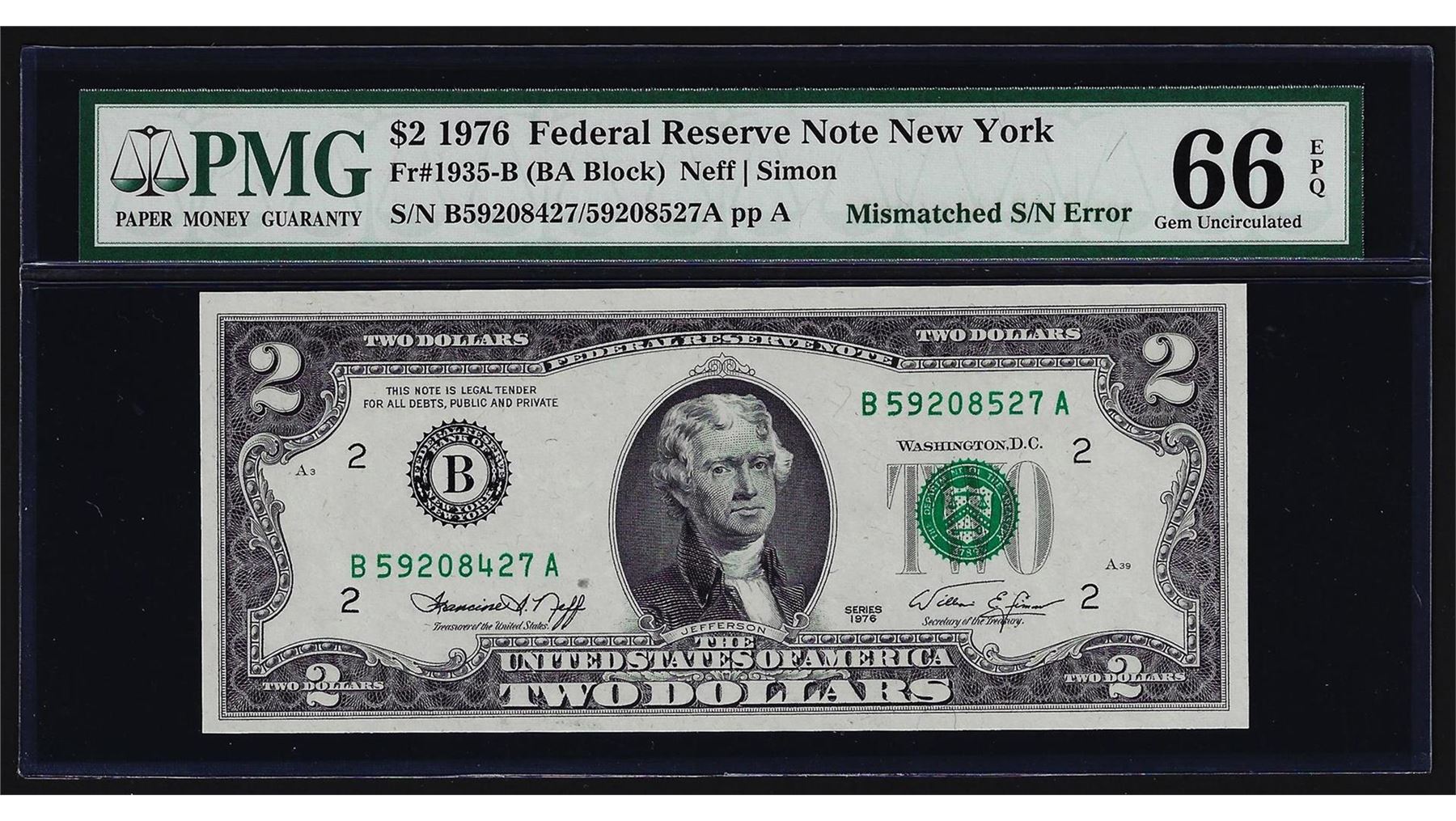 One 1976 $2 Federal Reserve Note Mismatched Serial Number ERROR PMG Gem Unc. 66EPQ. PMG Certified.