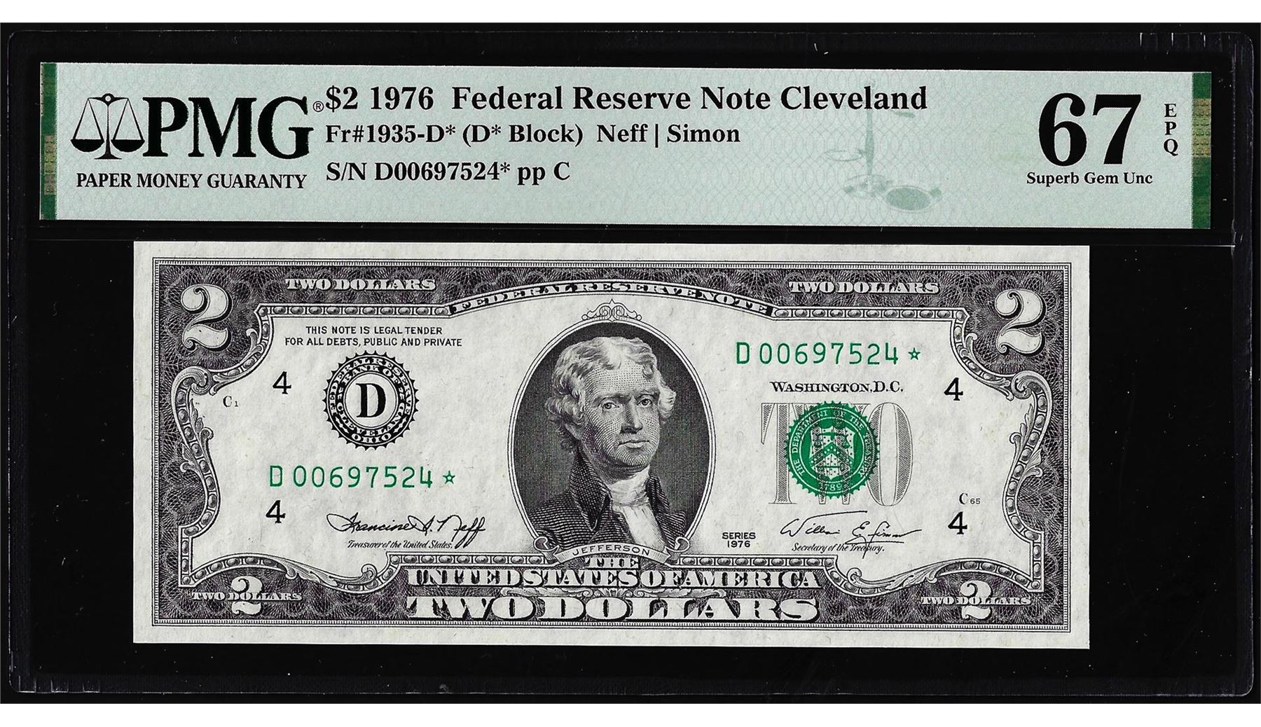 One 1976 $2 Federal Reserve STAR Note Fr.1935-D* Cleveland PMG Superb Gem Unc. 67EPQ. PMG Certified.