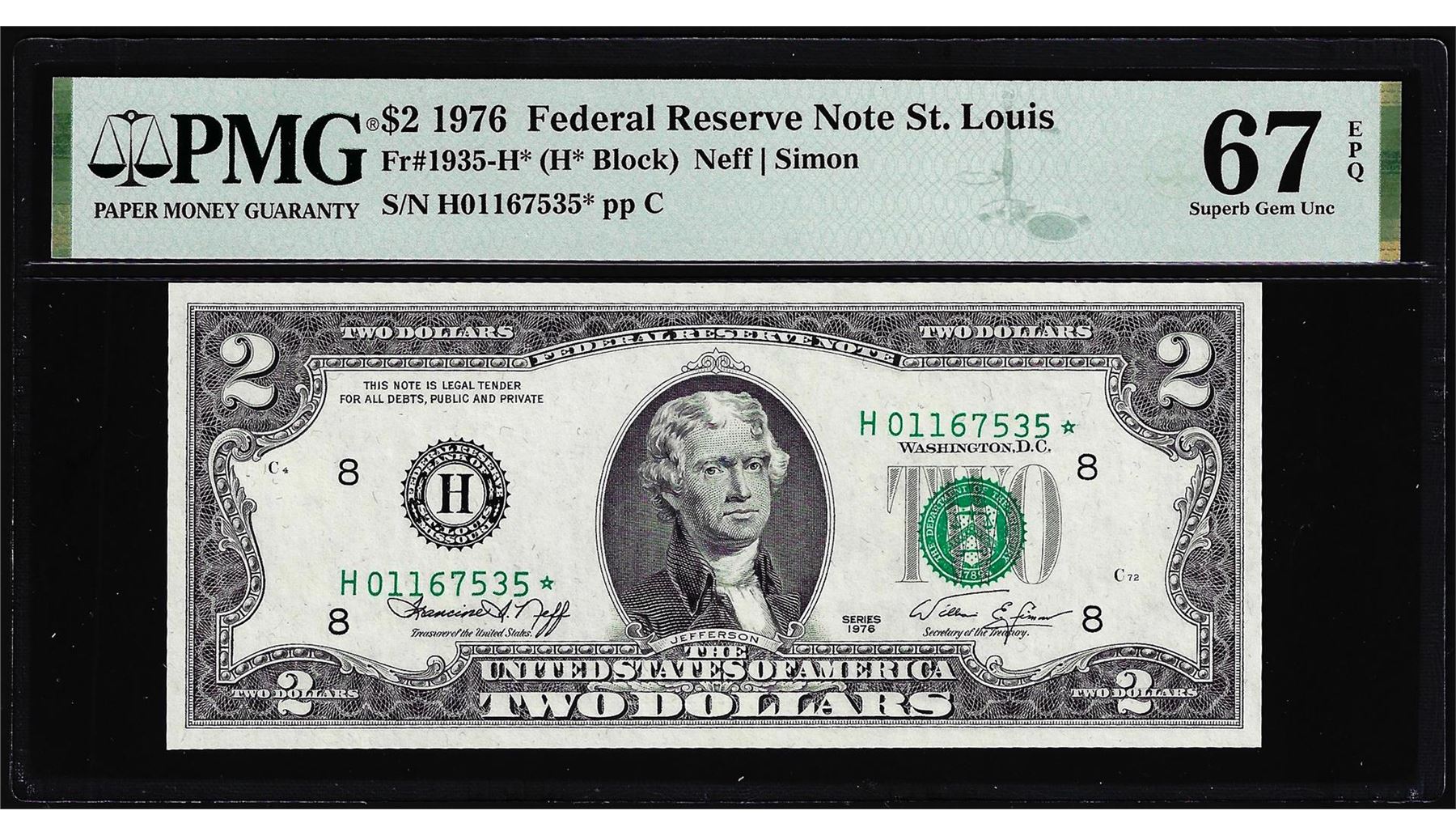 One 1976 $2 Federal Reserve STAR Note Fr.1935-H* St. Louis PMG Superb Gem Unc. 67EPQ. PMG Certified.