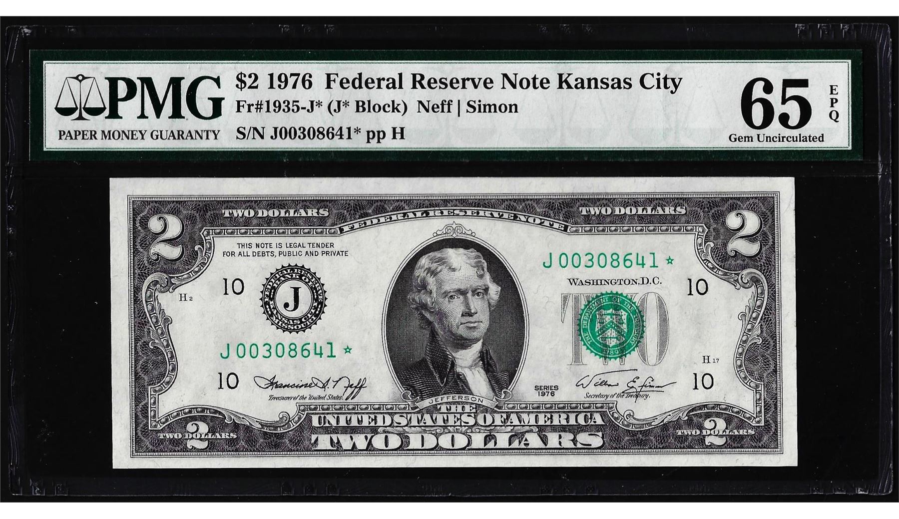 One 1976 $2 Federal Reserve STAR Note Kansas City Fr.1935-J* PMG Gem Uncirculated 65EPQ. PMG Certified.