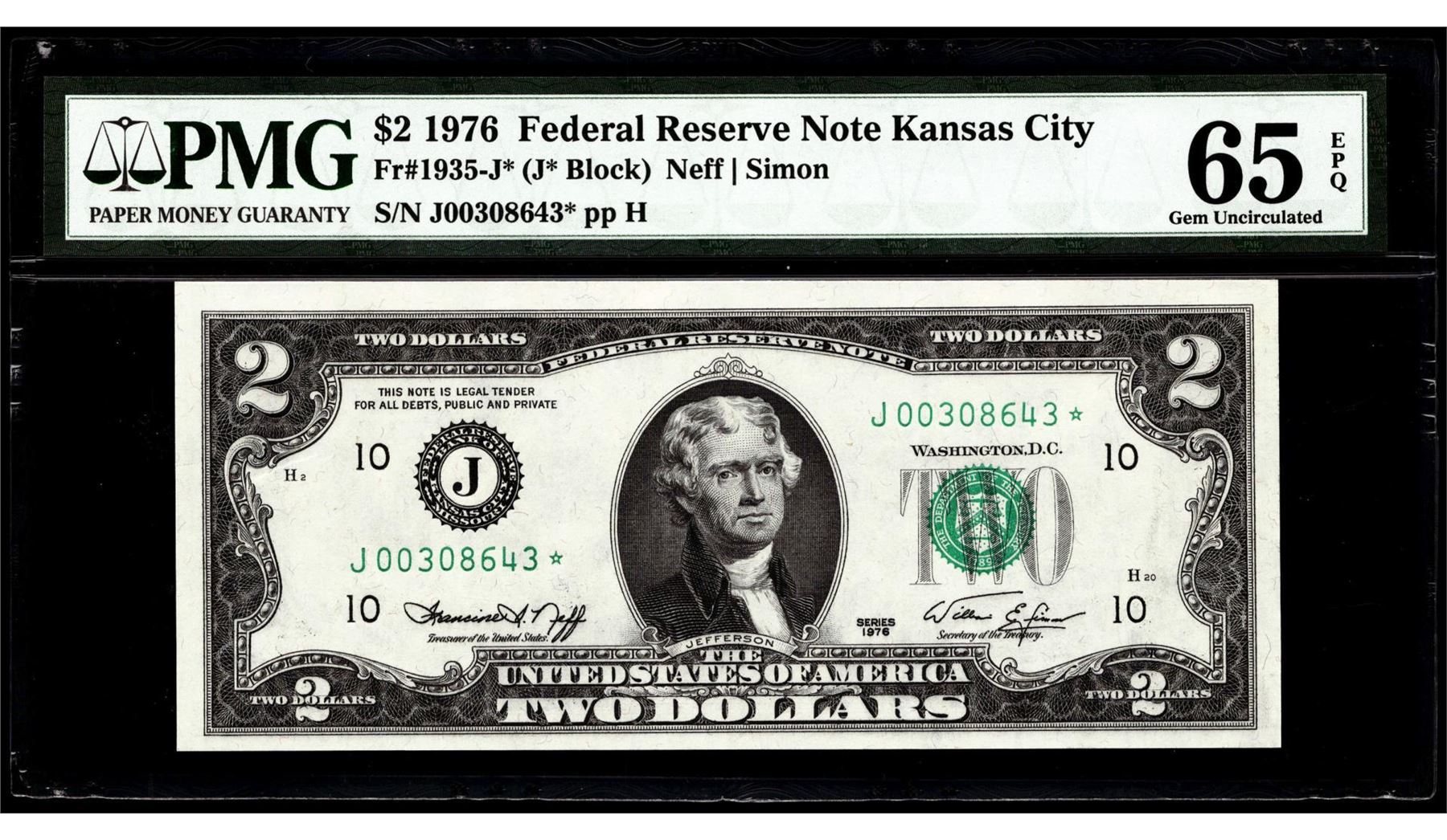 One 1976 $2 Federal Reserve STAR Note Kansas City Fr.1935-J* PMG Gem Uncirculated 65EPQ. PMG Certified.
