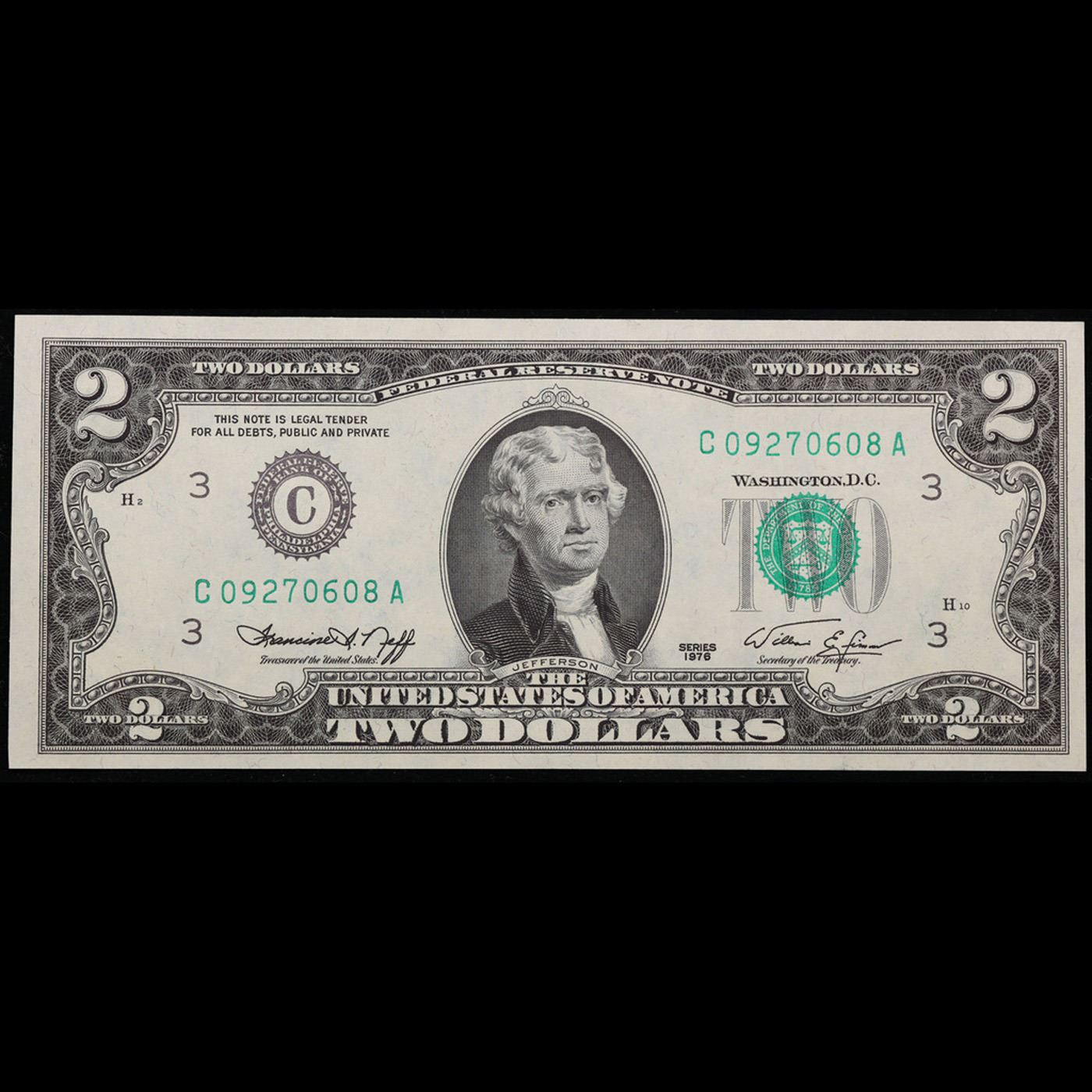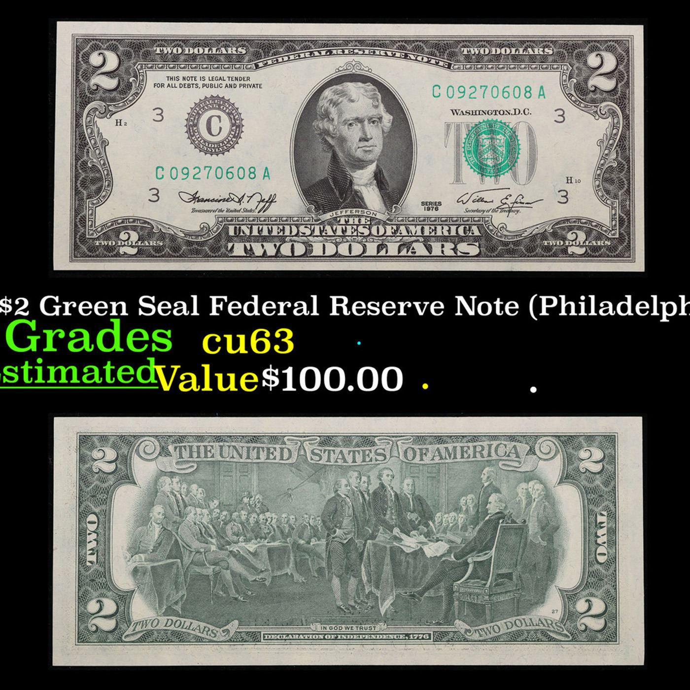 1976 $2 Green Seal Federal Reserve Note (Philadelphia, PA) Grades Select CU