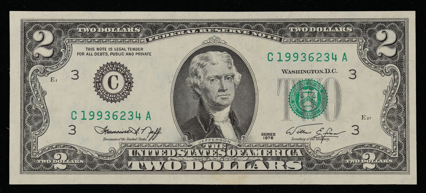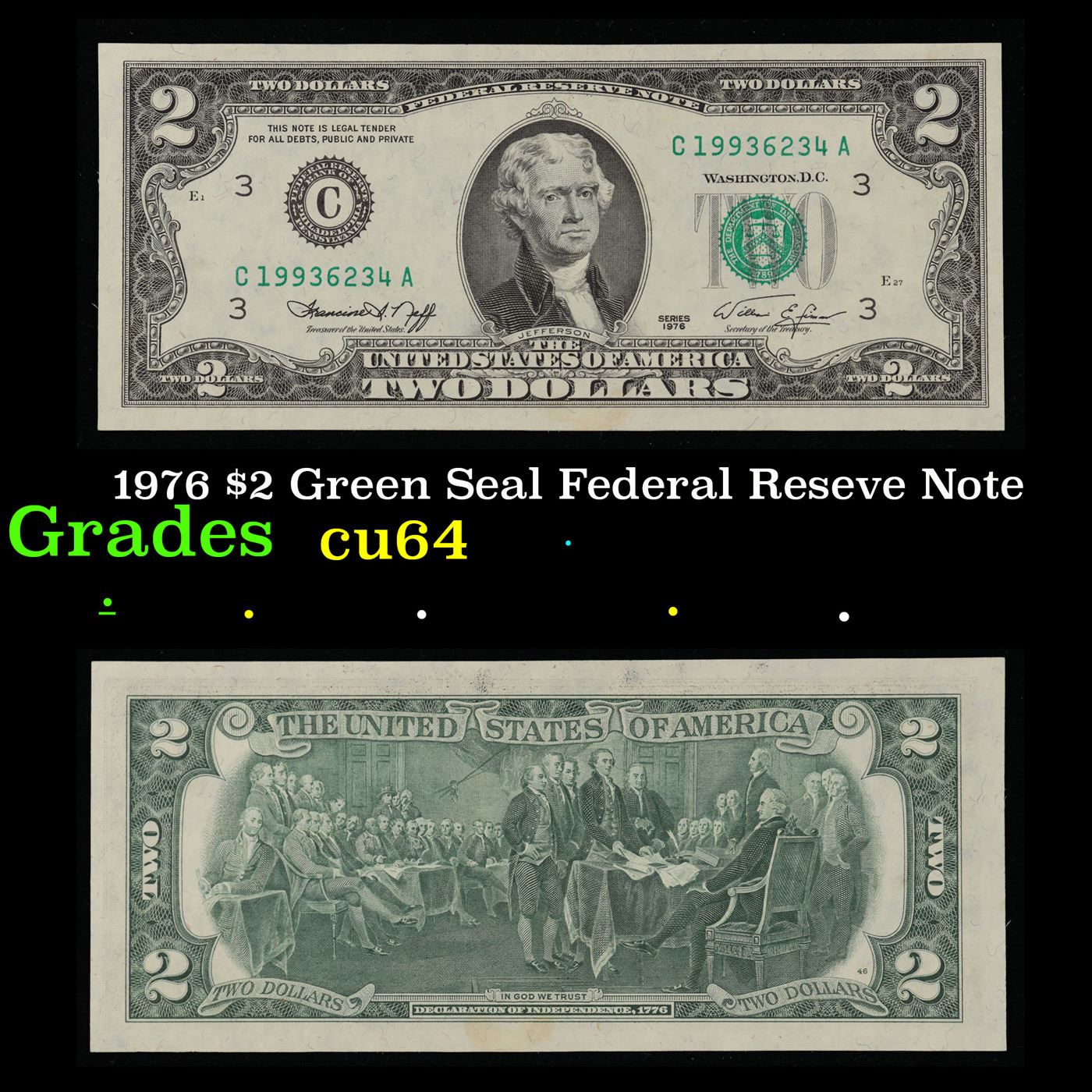 1976 $2 Green Seal Federal Reseve Note Grades Choice CU.