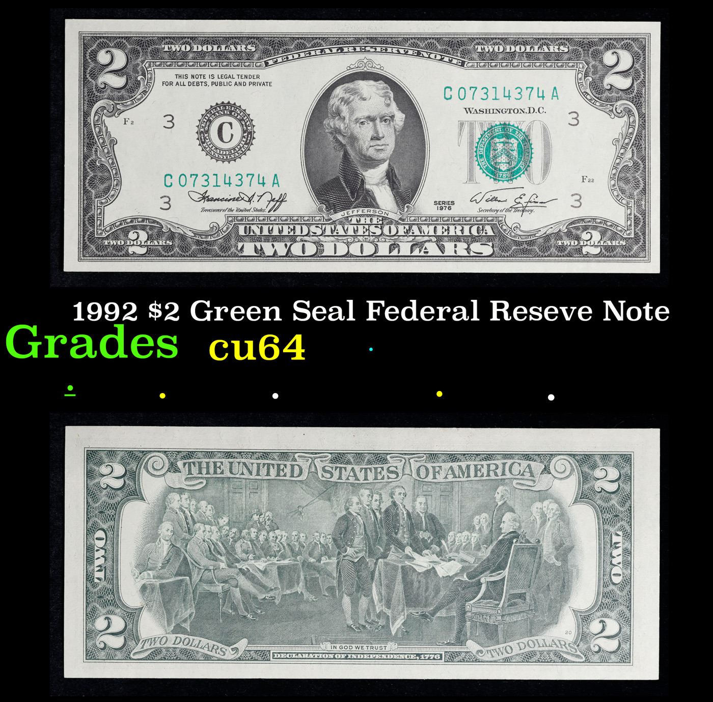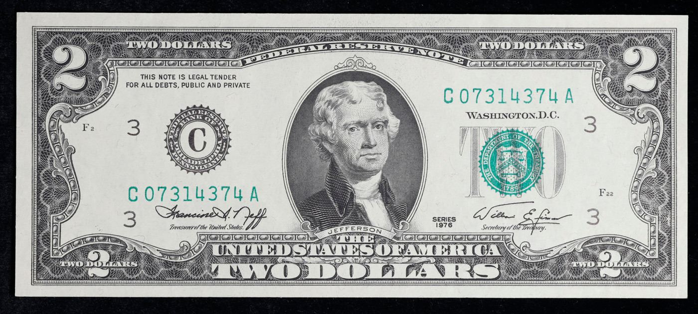 1976 $2 Green Seal Federal Reseve Note Grades Choice CU
