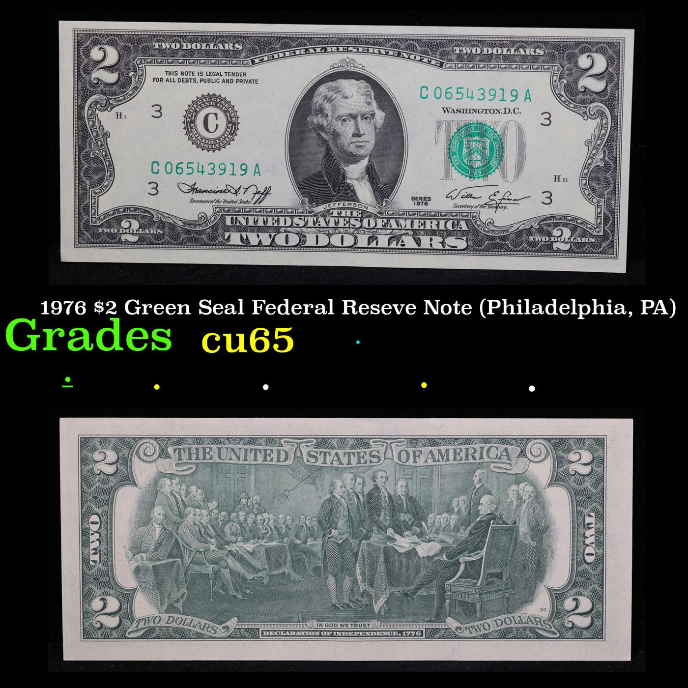 1976 $2 Green Seal Federal Reseve Note (Philadelphia, PA) Grades Gem CU.