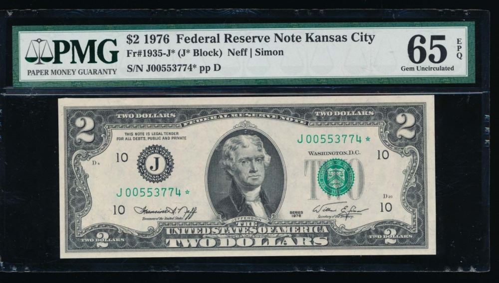 One 1976 $2 Kansas City Federal Reserve STAR Note PMG 65EPQ.