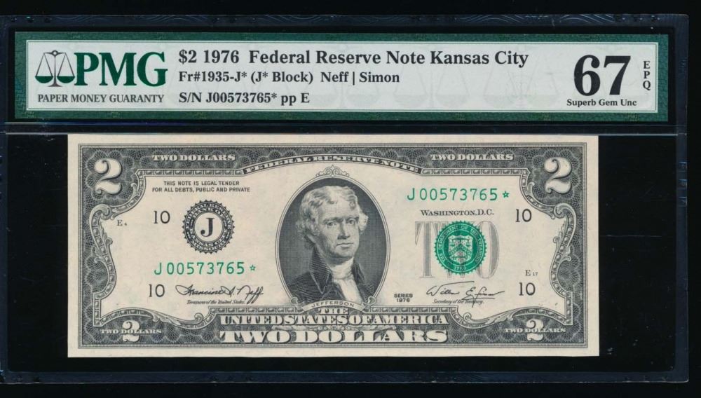 One 1976 $2 Kansas City Federal Reserve STAR Note PMG 67EPQ.