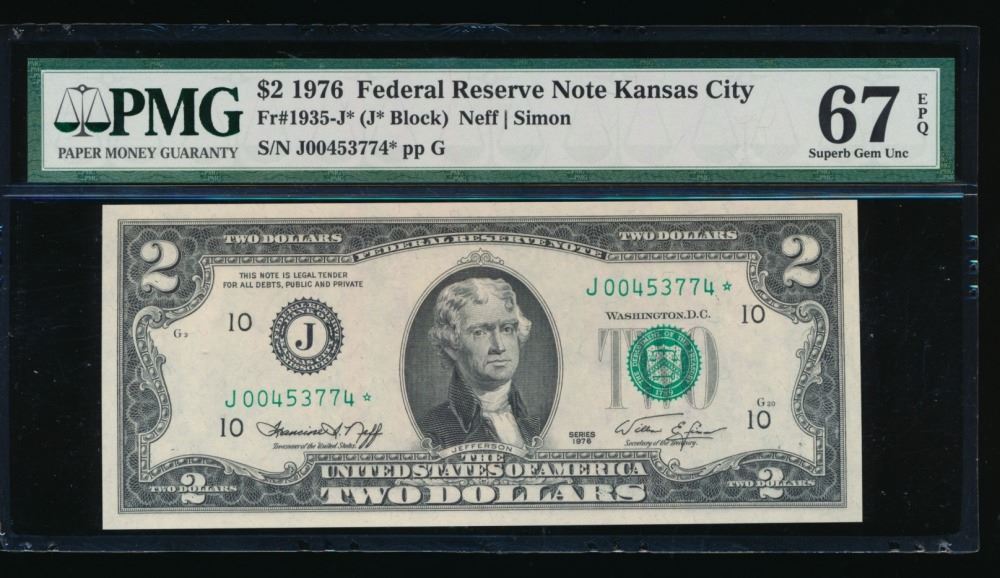 One 1976 $2 Kansas City Federal Reserve STAR Note PMG 67EPQ.