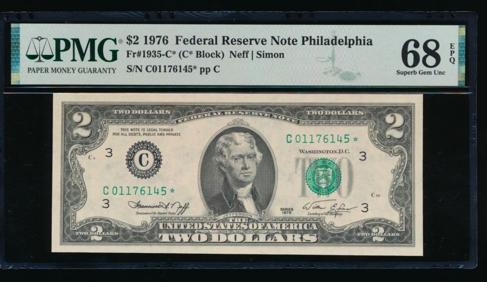 One 1976 $2 Philadelphia Federal Reserve STAR Note PMG 68EPQ.